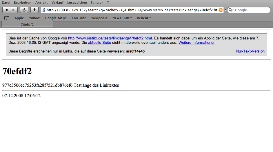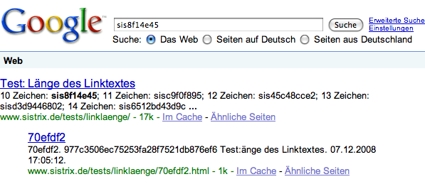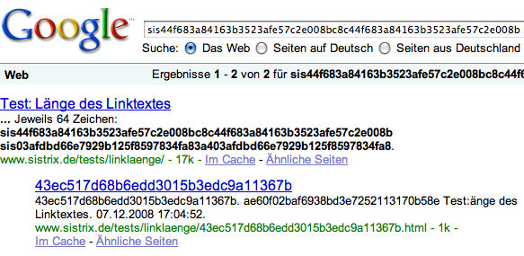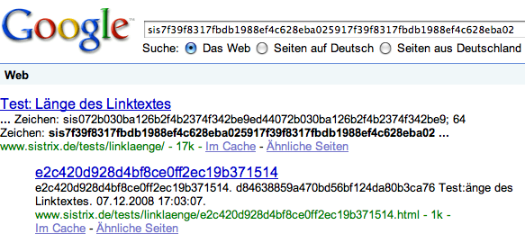 Neben der Übersichtsseite, von der verlinkte wurde ist auch die Zielseite zu finden. Wenn man auf Cache klickt, kommt wie erwartet die Info: „Diese Begriffe erscheinen nur in Links, die auf diese Seite verweisen: sis8f14e45“. Ich dachte mir, dass ich die Links jetzt einfach durchgehe und bei irgendeiner Zahl feststelle, dass Google nicht mehr den (kompletten) Linktext nutzt. Hat leider nicht funktioniert, Google nutzt auch bei dem Link der volle 64 Zeichen lang ist den ganzen Linktext: