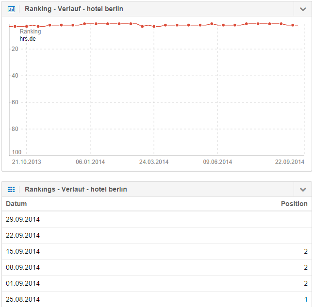 Trotz dieser augenscheinlichen Fehler ist die Höhe des Sichtbarkeitsverlustes überraschend. Ein Verlust von fast 90% war trotz der Fehler und Versäumnisse nicht zu erwarten. Google listet auch korrekt weitergeleitete Unterseiten nicht auf einer vergleichbaren Positon wie zuvor. Rankte hrs.de für “hotel berlin” vor der Umstellung auf Position 1 oder 2, ist die neue Seite, die korrekt umgeleitet wird und von Google auch indexiert wurde, nicht in den Top-100 zu finden.