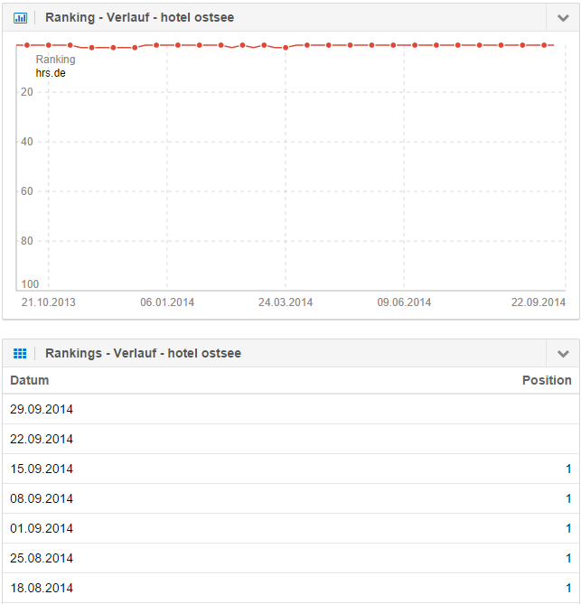 Rund 17% der URLs, die Anfang des Monats noch in Google rankten, liefern jetzt einen Fehlercode 404 (Nicht gefunden) zurück. Google verliert in diesem Fall keine Zeit und entfernt diese Seiten aus den Suchergebnissen. Sichtbar wird das beim Keyword “Hotel Ostsee”: rankte hrs.de lange auf Position 1, ist die Ziel-URL jetzt nicht mehr vorhanden und Google hat die Domain aus den SERPs für dieses Keyword geworfen: