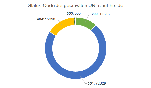 Nur rund 11% der erfassten Webseiten liefern einen Status-Code 200 zurück und signalisieren Google damit: alles in Ordnung, bitte nehme meine Inhalte in den Index auf. Bei rund 1% der Seiten kam es zu einem Serverfehler (Status-Code: 503). Mehr als 15% der internen Links verweisen auf nicht mehr existente URLs (Status-Code: 404) und über 70% aller aktuell gesetzter, interner Links sind 301-Weiterleitungen. Bei der Bewertung dieser Zahlen ist wichtig, dass es sich um ein aktuelles Abbild der Seite handelt. Der Crawler fängt auf der Startseite der Domain an und folgt internen Links, die der Webseitenbetreiber selber gesetzt hat. Bei hrs.de erhält der Crawler derzeit aber nur bei etwa jeder 10. Seite auf Anhieb eine Antwort vom Server mit dem Status-Code 200, was so viel bedeutet wie OK, die Anfrage wurde erfolgreich bearbeitet und das Ergebnis der Anfrage wird in der Antwort übertragen. In fast 90 % der Fälle antwortet der Server jedoch, dass sich die Inhalte nicht auf der intern verlinkten URL befinden.