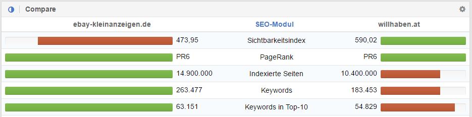 Dennoch, von den insgesamt 183.453 Keywords kann willhaben.at zu 54.829 unterschiedlichen Keywords (⅓) ein Top 10 Ranking bei google.at verbuchen. Ebay-kleinanzeigen.de kann allerdings zu 63.151 ein Top 10 Ranking erzielen – und trotzdem hat willhaben.at eine größere Sichtbarkeit (mehr dazu später).