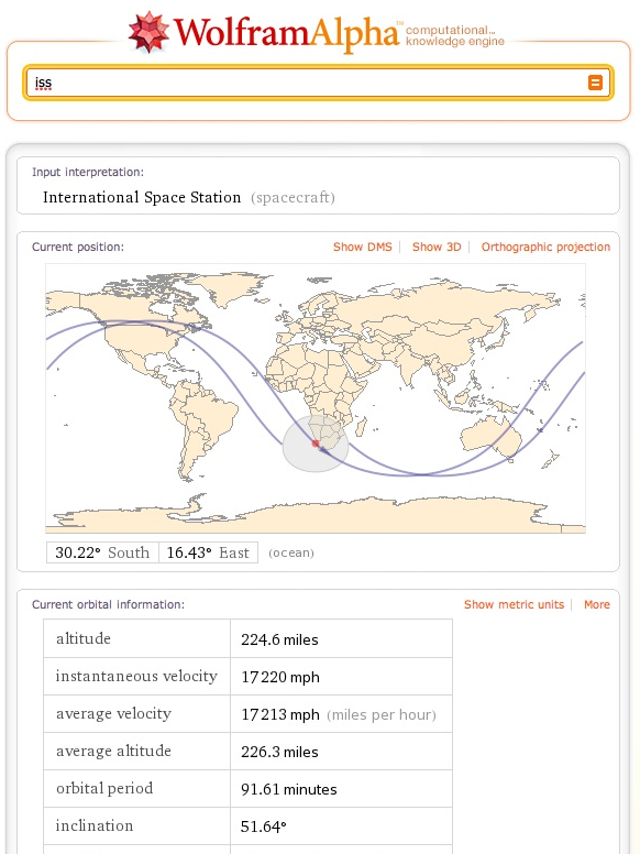 Während der übliche Suchablauf bei Google so ist, dass man ein Keyword sucht, die ersten paar Treffer bewertet und seine Informationen dann in der Regel in einer der gefundenen Seiten erhält, will Wolfram|Alpha den mittleren Teil selber erledigen: der User soll direkt in der Suchmaschine die Antwort auf seine Frage erhalten. Vereinfacht ausgedrückt, sammelt Wolfram|Alpha dazu eine große Menge strukturierter Daten und bewertet die Zuverlässigkeit der Daten anhand vieler (wirklich vieler) Algorithmen. Mit dieser Datenbasis werden Fragen dann beantwortet und die Antwort direkt durch die Suchmaschinen dargestellt. Hier rechts der Screenshot zeigt beispielsweise, wie auf die Suchanfrage „ISS“ die aktuelle Positionen und weitere Inforationen zur SpaceStation dargestellt werden. Was sich in der Theorie erstmal toll anhört, hat in der Praxis einen entscheidenden Fehler: es können nur Antworten auf Fragen gefunden werden, zu denen Daten vorliegen. Und da diese strukturierten Daten, die dafür benötigt werden hauptsächlich im wissenschaftlichen Bereich zu Hause sind, sind die Einsatzmöglichkeiten der neuen Suchmaschine recht überschaubar.