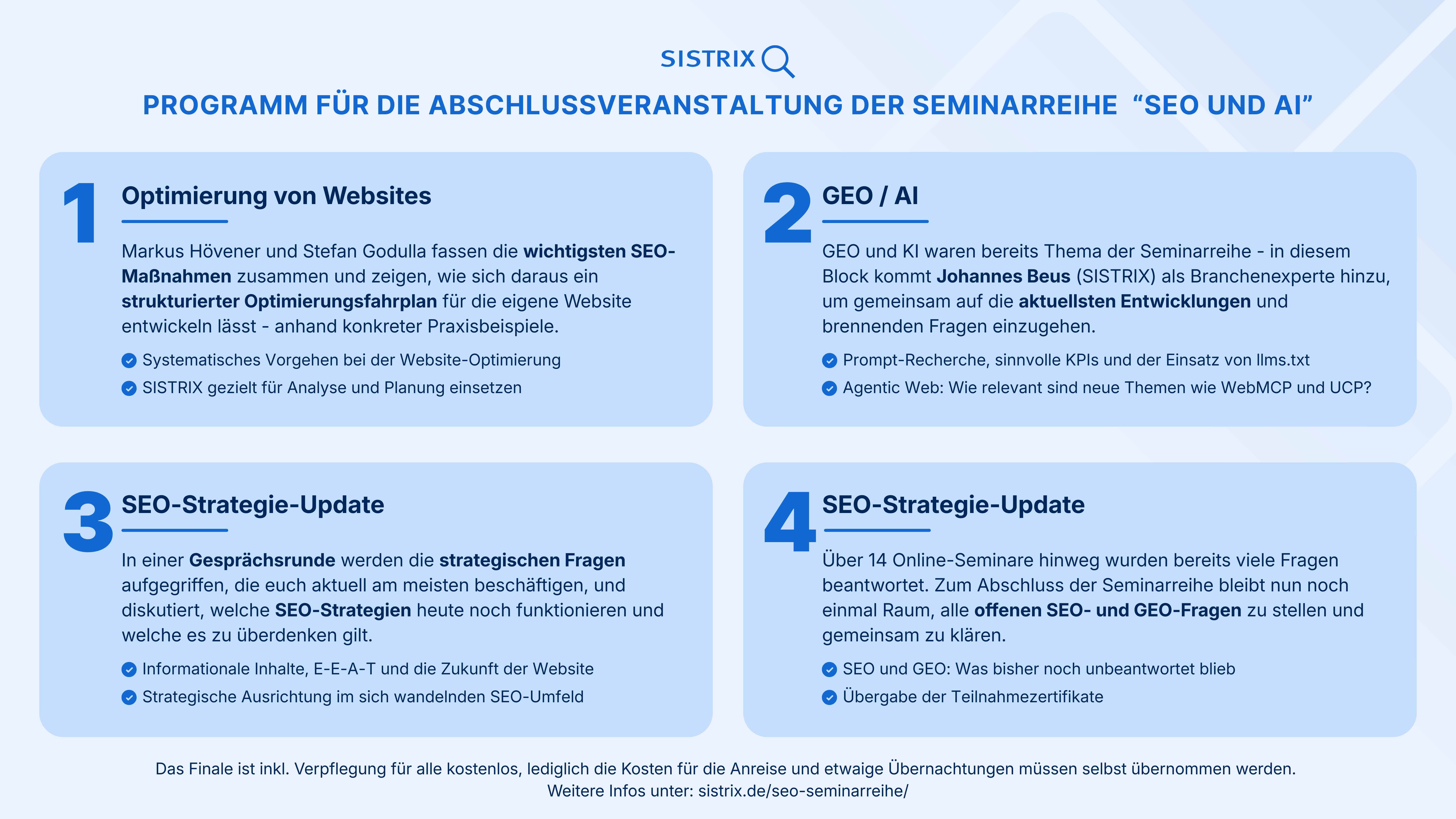 Die Seminarreihe „SEO & AI – Was ändert sich und was bleibt gleich“ läuft auf Hochtouren. Alle Infos zum Finale haben wir den Teilnehmenden per Mail geschickt. Hier kannst du dich anmelden (Nutze dafür bitte die Daten, die du auch für die initiale Anmeldung für die Seminarreihe genutzt hast):