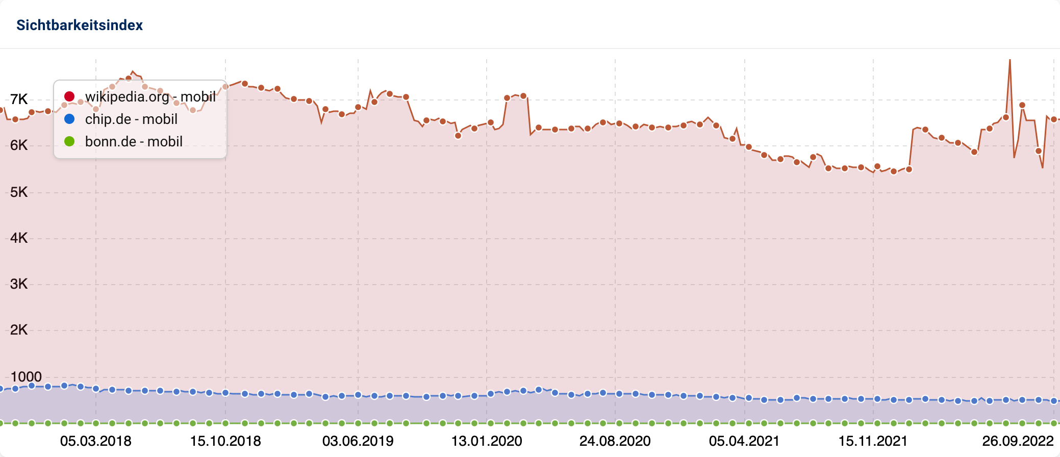 Schon im Vergleich der drei Sichtbarkeitscharts ist zu sehen, dass wikipedia.org in Sachen Sichtbarkeit deutlich stärker ist als chip.de und erst recht als die Domain bonn.de.