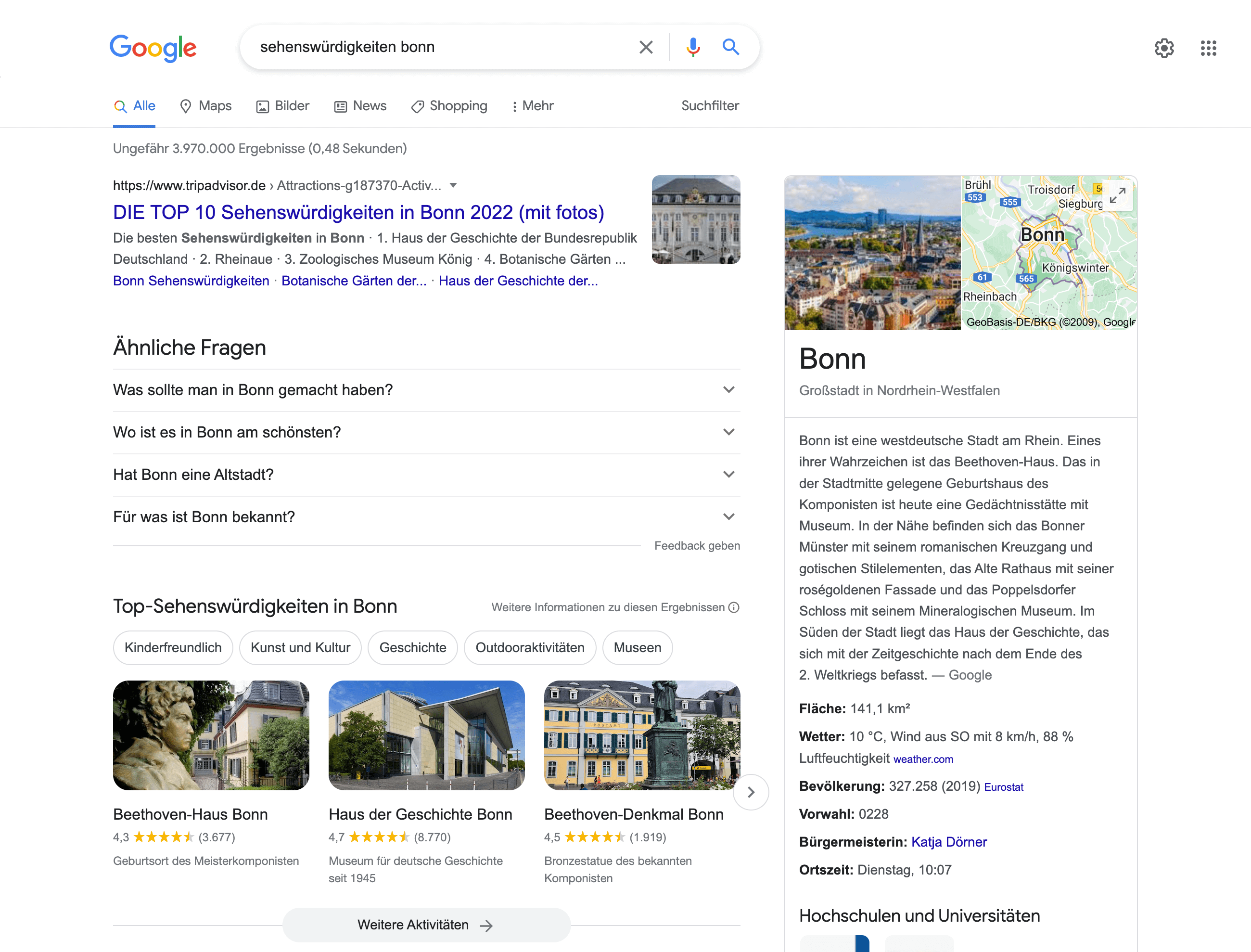 Bonn.de als Website der Bonner Stadtverwaltung liefert hingegen Inhalte zu Keywords, die einen Bezug zu Bonn und der Region haben. Zu einem Suchbegriff wie “denkmal wurzen” hat die Website – sinnvollerweise – keine Inhalte. Google betrachtet bonn.de deswegen nicht als relevant für diesen Suchbegriff und listet als Treffer auf den Suchergebnisseiten andere Domains, wie zum Beispiel Wikipedia.