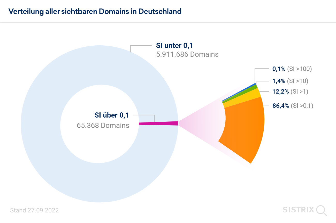 Wichtig ist: Der Großteil der Domains, für die ein Sichtbarkeitswert berechnet wird, haben einen Wert unter 0,1. Am 24.02.2023 beispielsweise wurden für die Berechnung insgesamt etwa 6 Millionen Domains betrachtet – und nur 1 Prozent von ihnen hatte letztlich einen Wert über 0,1.