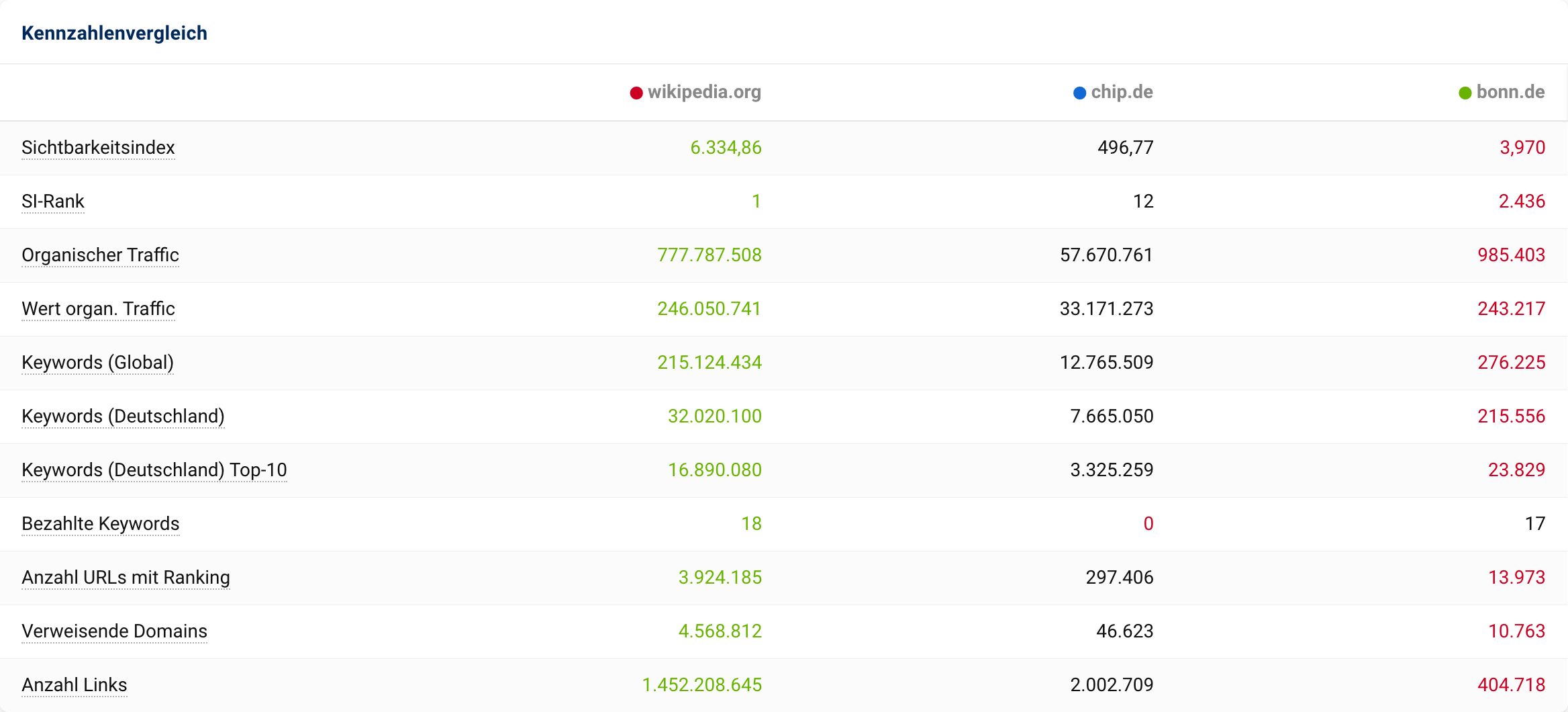 Um dir gleich mal einen praktischen Einblick zu geben, vergleichen wir drei Domains miteinander: wikipedia.org, chip.de und bonn.de.