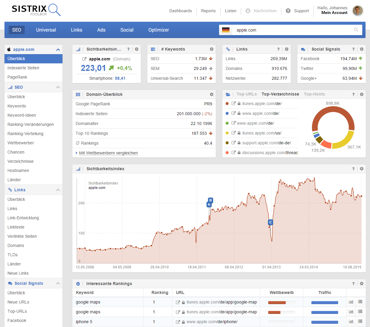 Seit 2008 ist der SISTRIX Sichtbarkeitsindex der anerkannte Maßstab für SEO-Erfolg. Wir messen jeden Tag die Google-Rankings von vielen Millionen Suchbegriffen und bereiten sie einfach verständlich zum Sichtbarkeitsindex auf.
