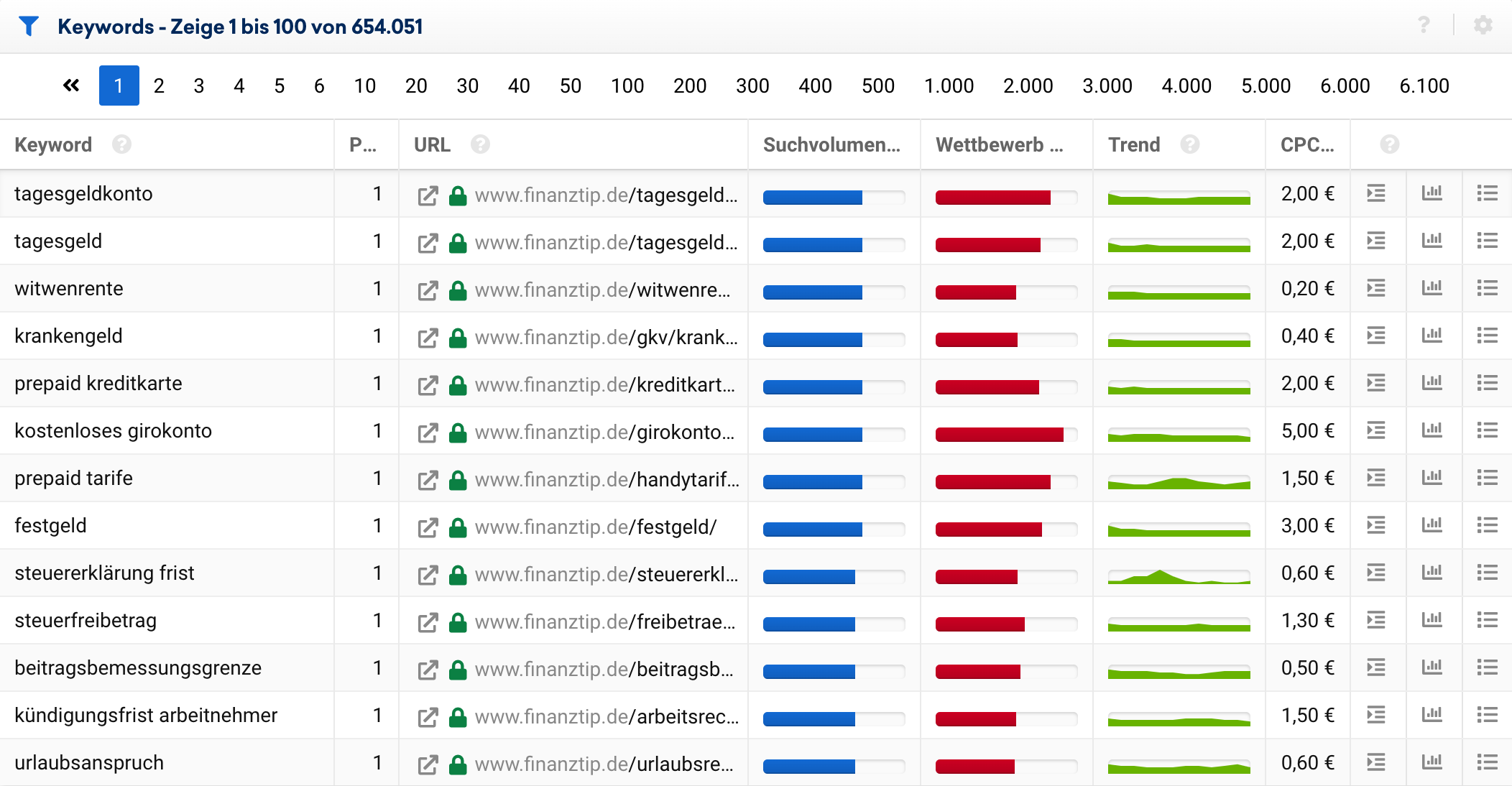 Mit der Suche im oberen Bereich von SISTRIX kannst du zu jeder Domain navigieren. Nutze danach die Navigation auf der linken Seite, um zur gewünschten Auswertung zu gelangen. Hier siehst du beispielsweise, mit welchen Keywords die Domain finanztip.de bei Google rankt: