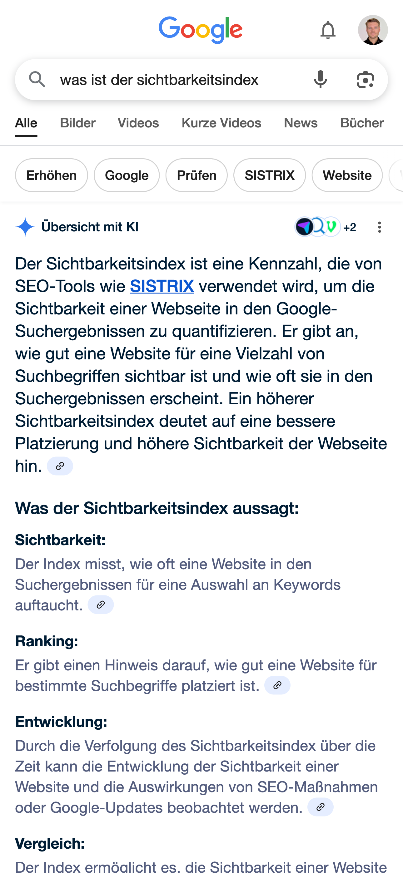 Die Lösung mit SISTRIX: Wir bei SISTRIX arbeiten bereits intensiv daran, den AI Mode in unser Produkt zu integrieren, damit du auch hier bald aussagekräftige Analysen durchführen kannst.