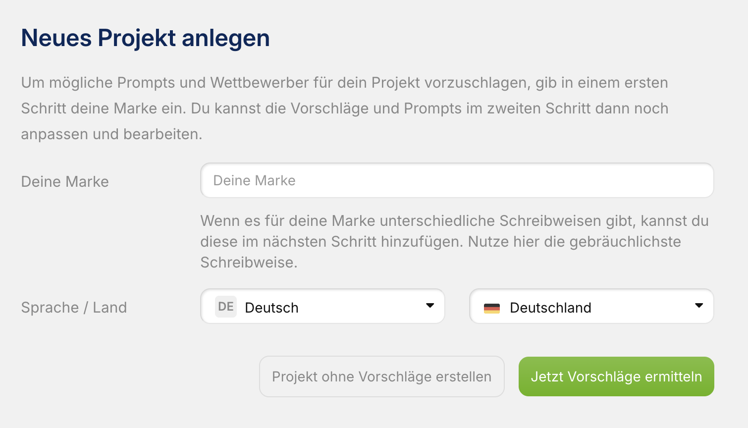 Der Projekt-Erstellungs-Assistent führt Dich detailliert durch den Setup. Im ersten Schritt definierst Du Deine Marke, indem Du Deinen Markennamen in das Eingabefeld einträgst und die gewünschte Sprache sowie das Land (z.B. Deutsch/Deutschland) auswählst. Anschließend hast Du die Wahl: Klicke auf „Jetzt Vorschläge ermitteln“, um automatische Prompt-Vorschläge zu erhalten, oder wähle „Projekt ohne Vorschläge erstellen“, wenn Du lieber komplett manuell starten möchtest.