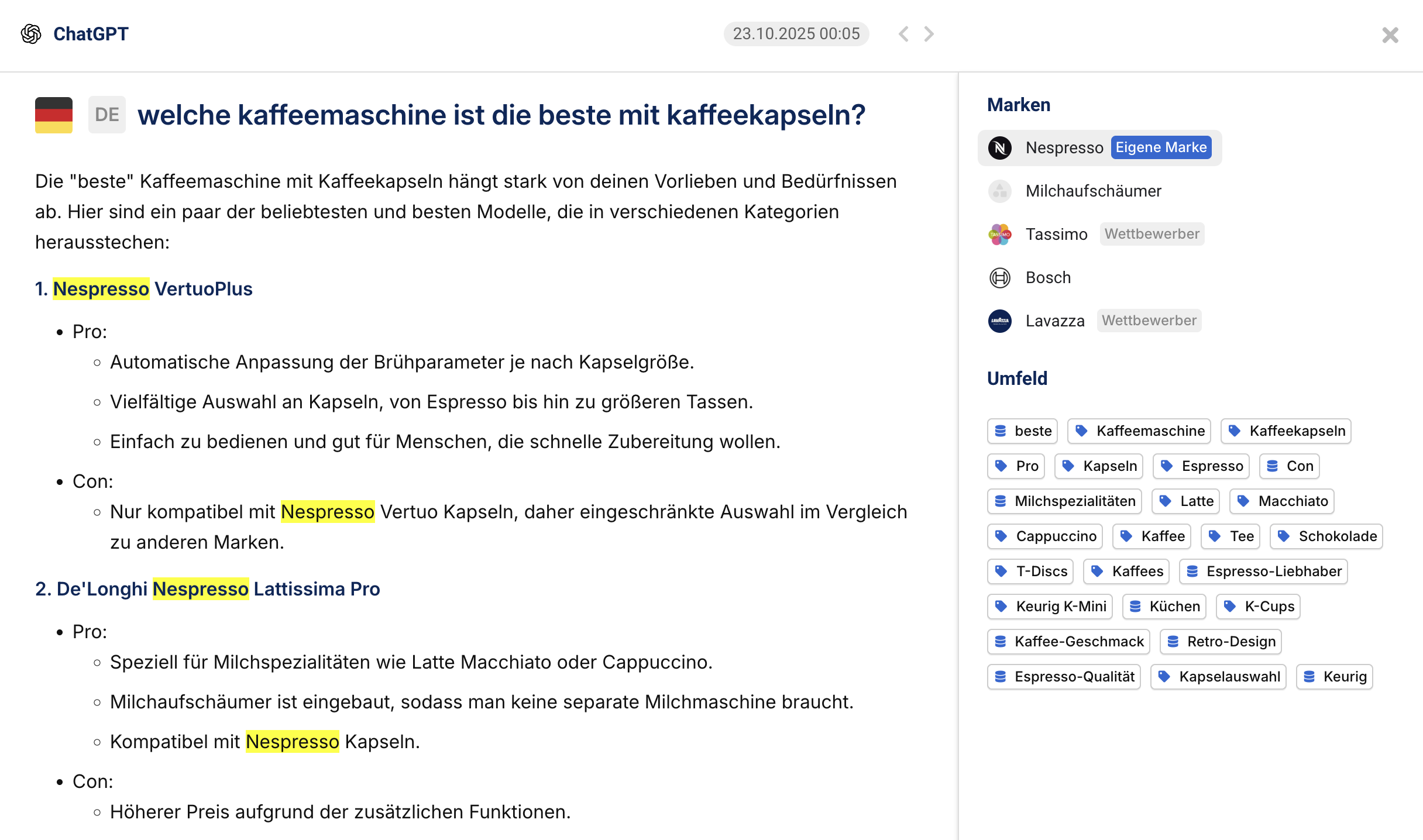 Wenn Du auf einen beliebigen Prompt in der Liste klickst, öffnet sich die Detailansicht. Dort siehst Du den vollständigen AI-Text von jedem Modell, wobei alle Marken-Erwähnungen (Deine und die der Wettbewerber) farblich hervorgehoben sind, sowie das Datum der letzten Abfrage. Rechts in der Detailansicht findest Du zudem eine Analyse der erwähnten Marken und des thematischen Umfelds (Entitäten) speziell für diesen einen Prompt.