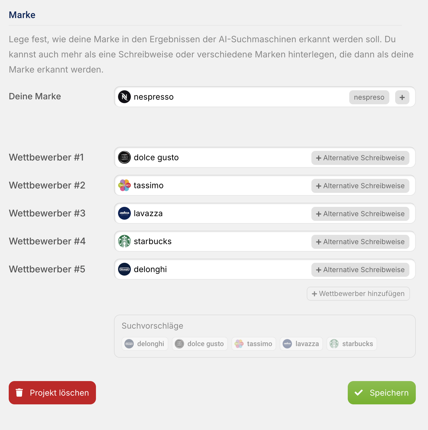 Analog dazu kannst Du unter Wettbewerber beliebig viele Wettbewerber hinzufügen oder bearbeiten. Nutze auch hier die „Alternative Schreibweise“-Funktion, falls eine Marke unter verschiedenen Namen bekannt ist, wie „SAP“ und „SAP SE“. Unter Aktionen findest Du schließlich die Optionen, um Deine Änderungen zu „Speichern“ oder das „Projekt löschen“, wodurch es mitsamt aller historischen Daten dauerhaft entfernt wird.