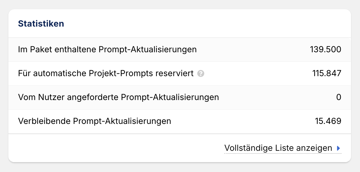 Besonders wichtig ist die Statistik-Box, die Dir eine Übersicht Deiner Prompt-Nutzung und Deine wichtigsten Kontingent-Kennzahlen zeigt. Dazu gehören Deine gesamten verfügbaren Credits („Im Paket enthaltene Prompt-Aktualisierungen“), die Kapazität, die für automatische System-Vorschläge reserviert ist, Deine manuell getriggerten Abfragen („Vom Nutzer angeforderte Prompt-Aktualisierungen“) und Dein noch verfügbares Kontingent.