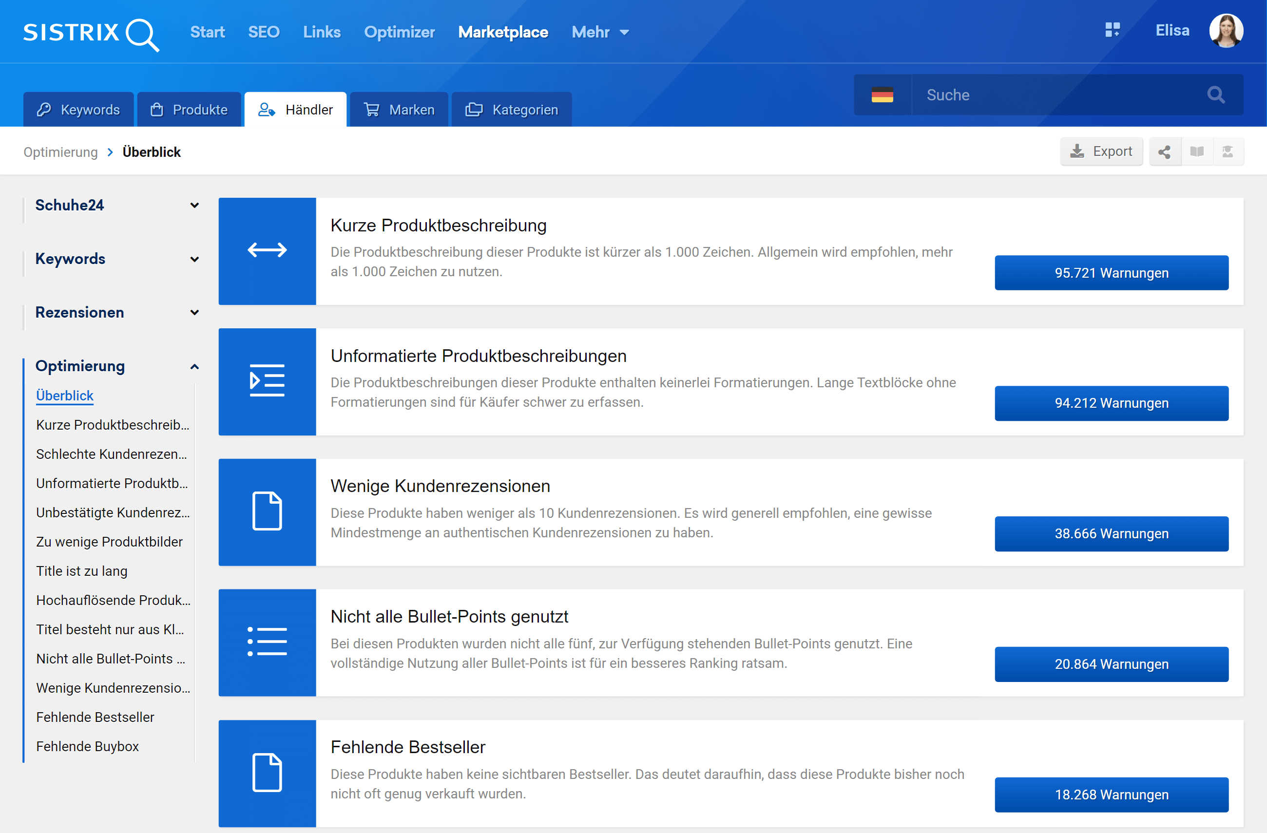 Der Bereich „Optimierung“ bietet nützliche Tipps, wie du deine Produktbeschreibungen verbessern kannst, um bessere Rankings bei Amazon zu erhalten. Klicke auf die einzelnen Warnungen oder auf die Menüpunkte auf der linken Seite, um die entsprechende Produktliste zu sehen.