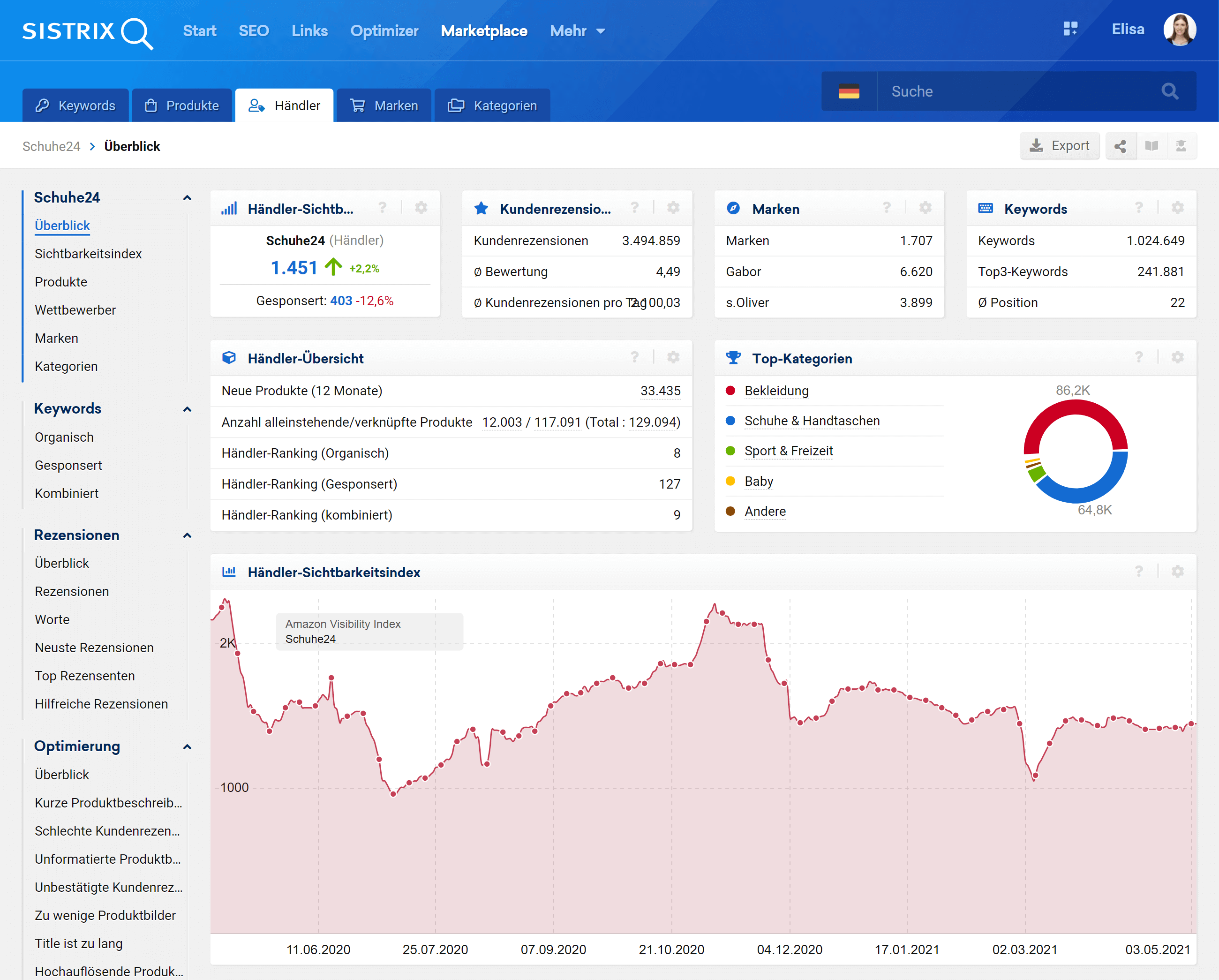 - Ø Position: Durchschnittliches Ranking des Händlers über alle gefundenen Keywords