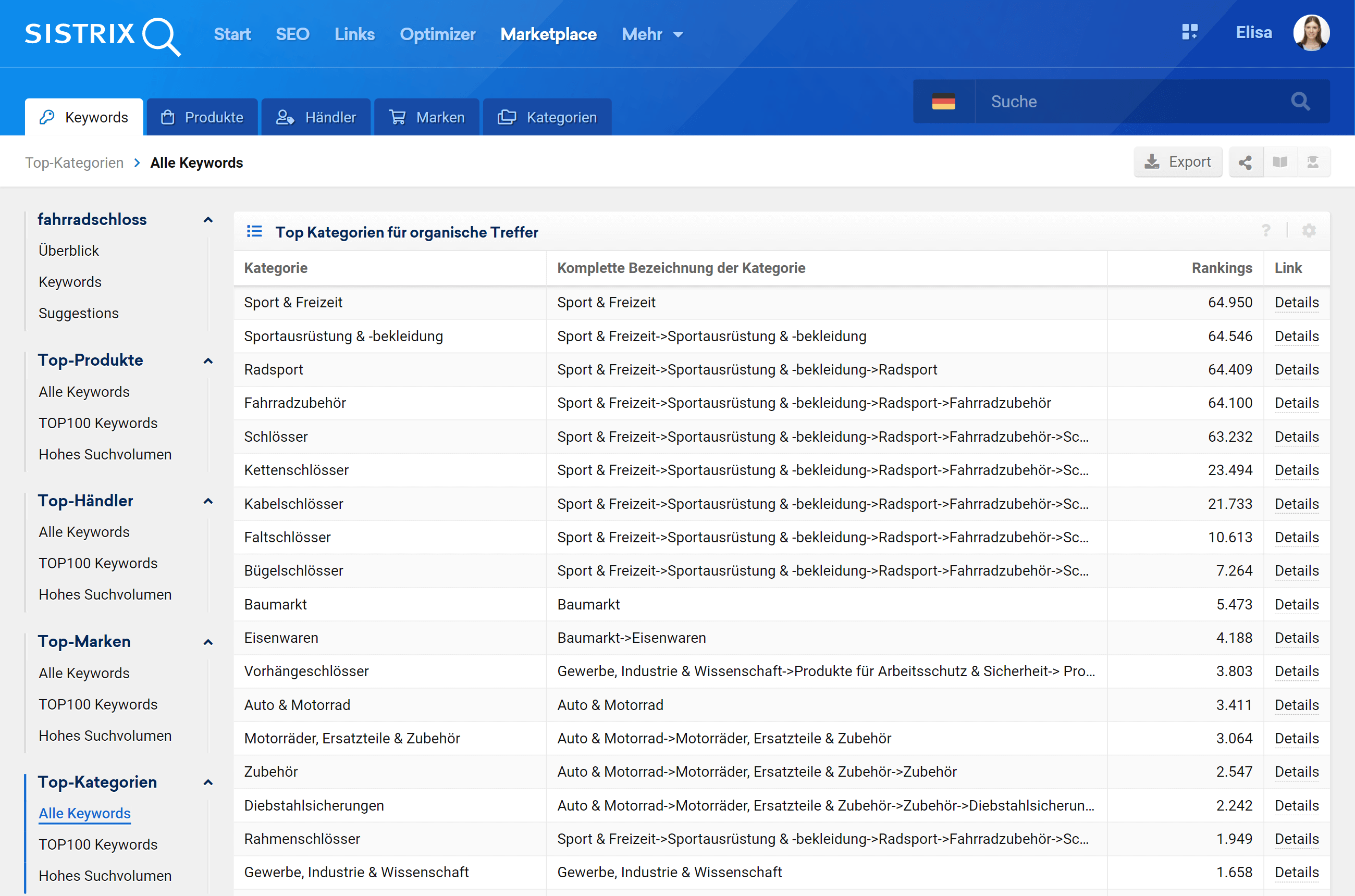Unter „Top-Kategorien“ findest du die erfolgreichsten Kategorien für die organischen und/oder gesponserten Treffer für das gesuchte Keyword. Du kannst dir alle Keywords, die Top 100 oder nur die mit dem höchsten Suchvolumen anzeigen lassen.