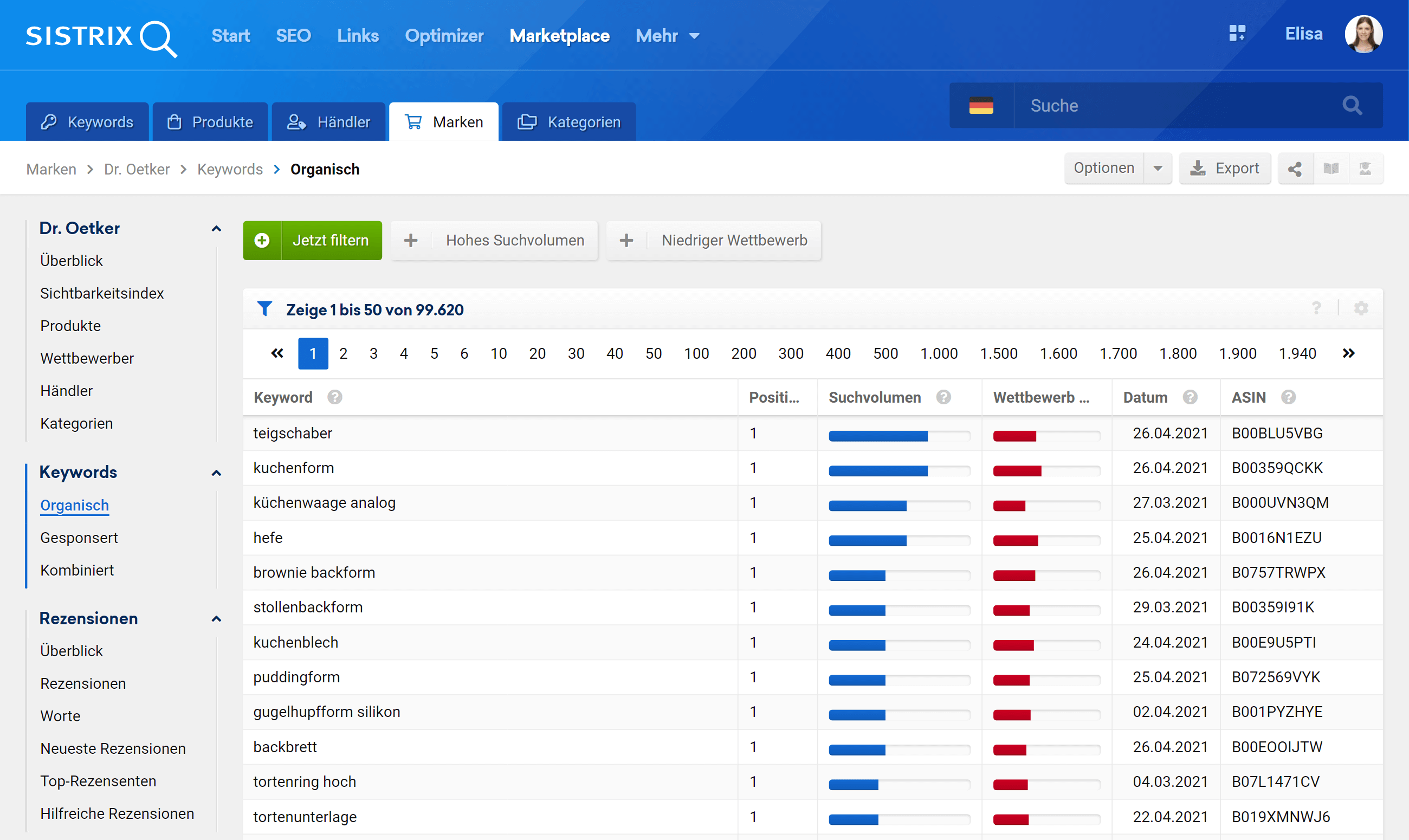 Der Menüpunkt „Keywords“ zeigt dir alle Suchbegriffe, mit denen die angegebene Marke in der Amazon-Suche gefunden werden kann. Die Suche betrifft die organischen Rankings, die gesponserten Rankings oder beides.