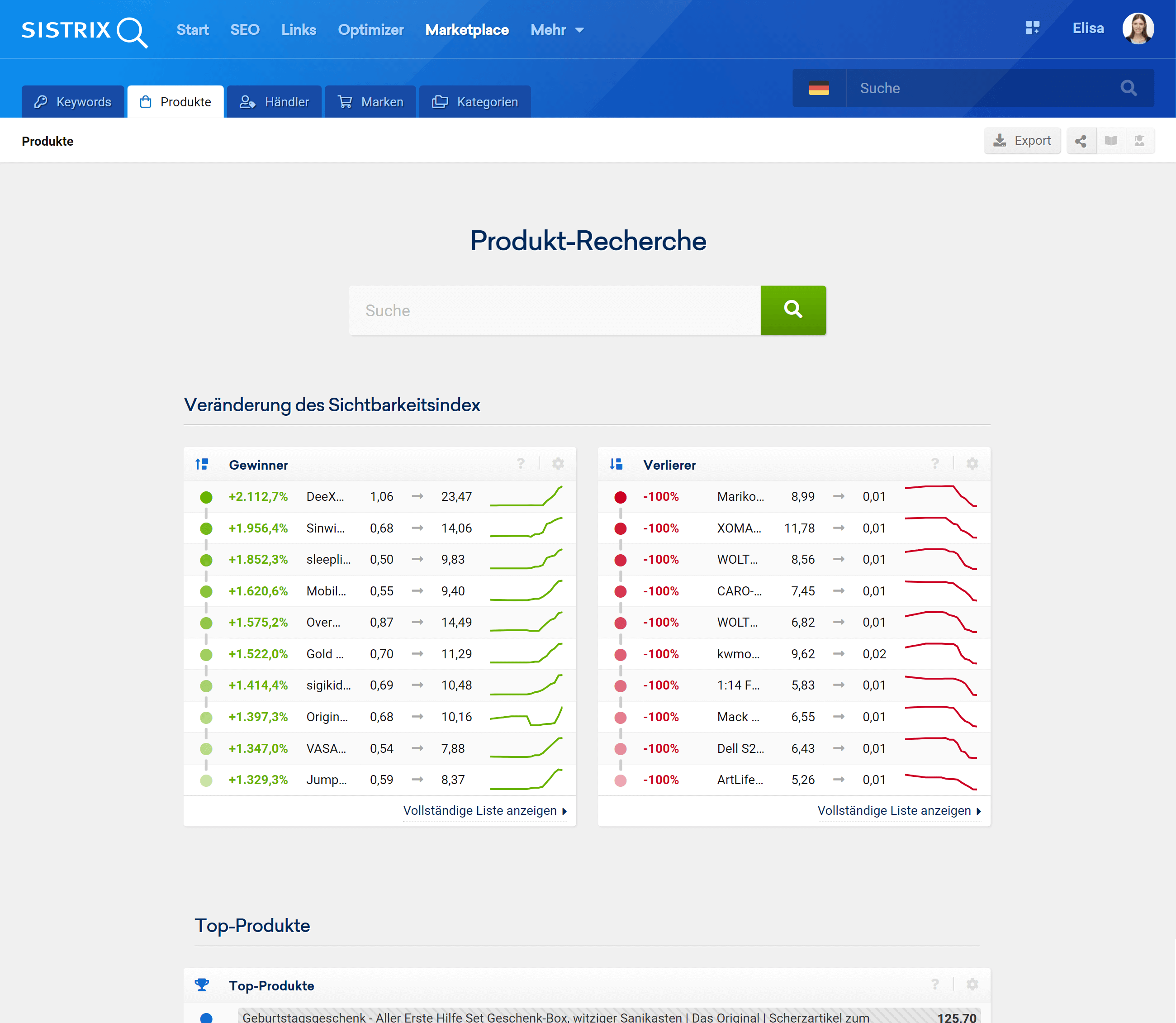 Die Produkte die im Vergleich zur letzten Woche am meisten im Sichtbarkeitsindex gewonnen bzw. verloren haben.