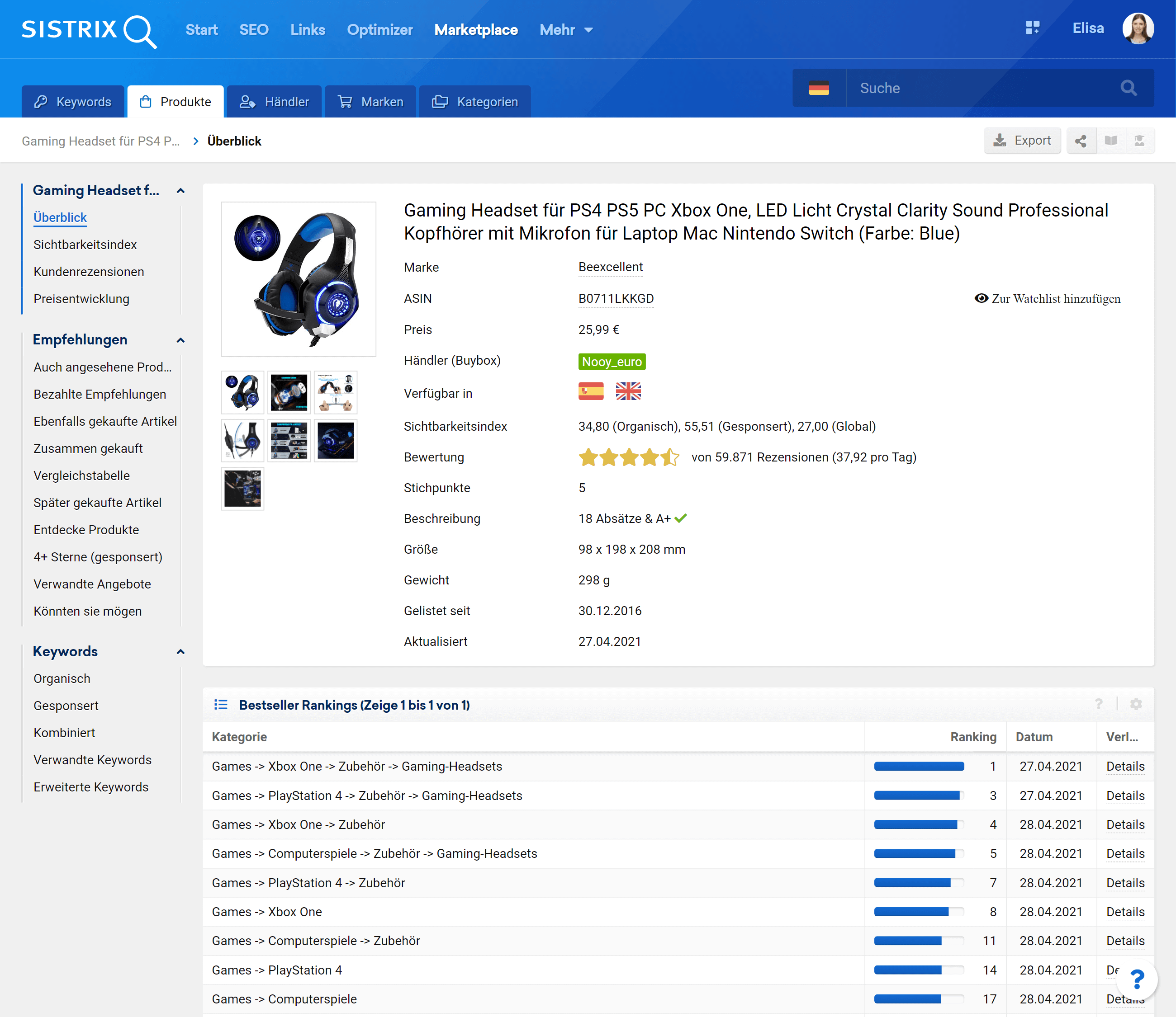 Nachdem du nach einem Produkt gesucht hast, wirst du auf dessen Überblicksseite weitergeleitet. Hier kannst du seine wichtigsten Informationen oder seine erfolgreichsten Rankings, Keywords und Händler sehen. Füge das Produkt zu deiner Watchlist hinzu, um es regelmäßig zu überprüfen.