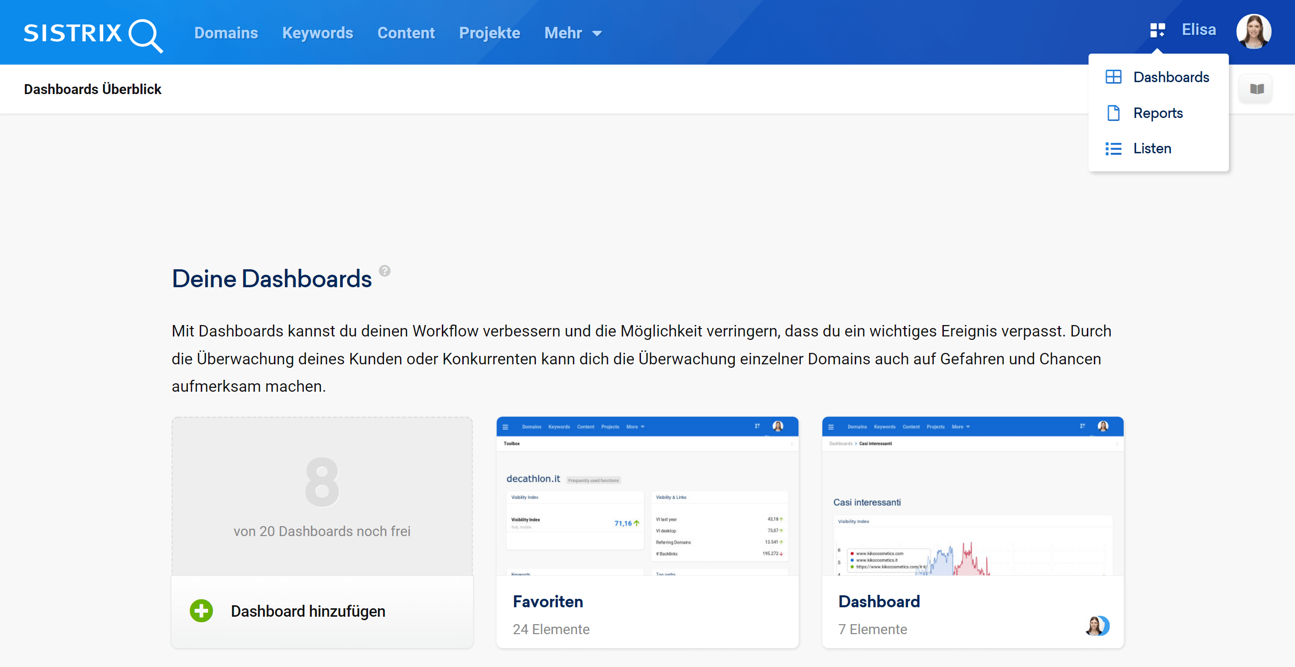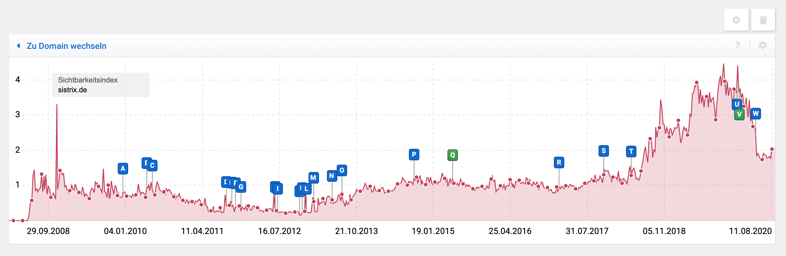 Die Dashboards der SISTRIX Toolbox können viel Zeit einsparen, Workflows verbessern und die Wahrscheinlichkeit verringern, dass du ein wichtiges Ereignis verpasst. Durch das Monitoring der eigenen Kunden oder Wettbewerber kann die Betrachtung von einzelnen Domains auch genutzt werden um potentielle Gefahren oder Chancen frühzeitig zu erkennen.