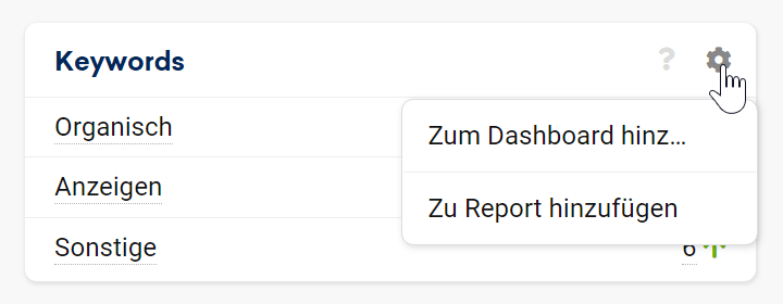In dieser Box kannst du einige interessante Ranking-Informationen über das Keyword-Set deines Projekts sehen: die Gesamtzahl der Top-10-Rankings, die gewonnenen, verlorenen und unveränderten Rankings.