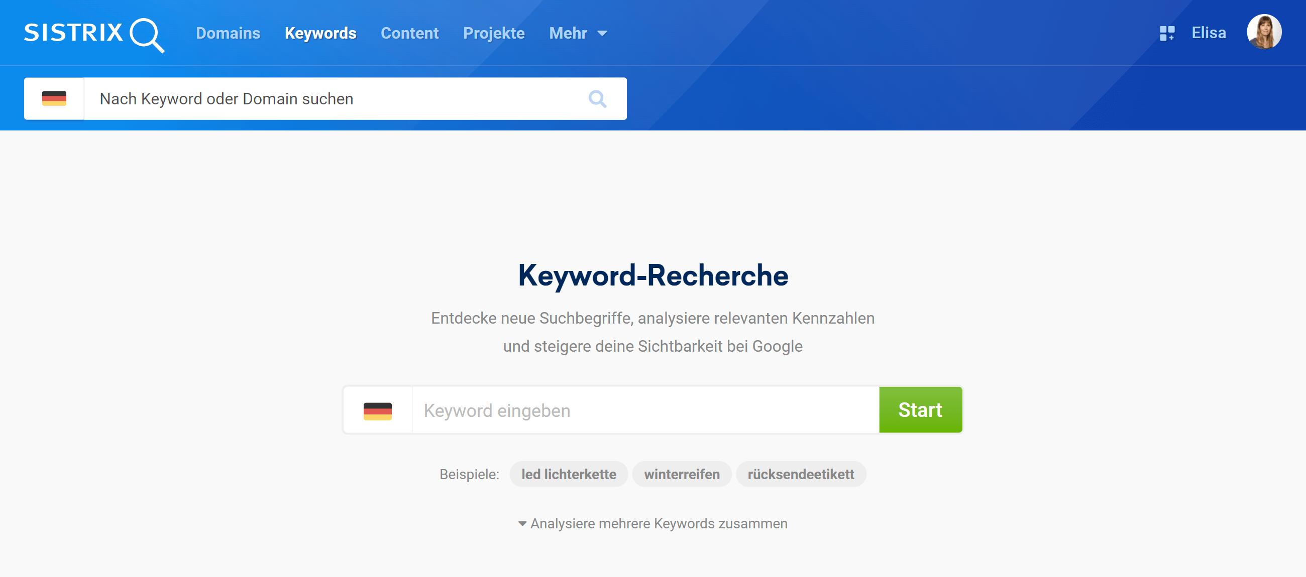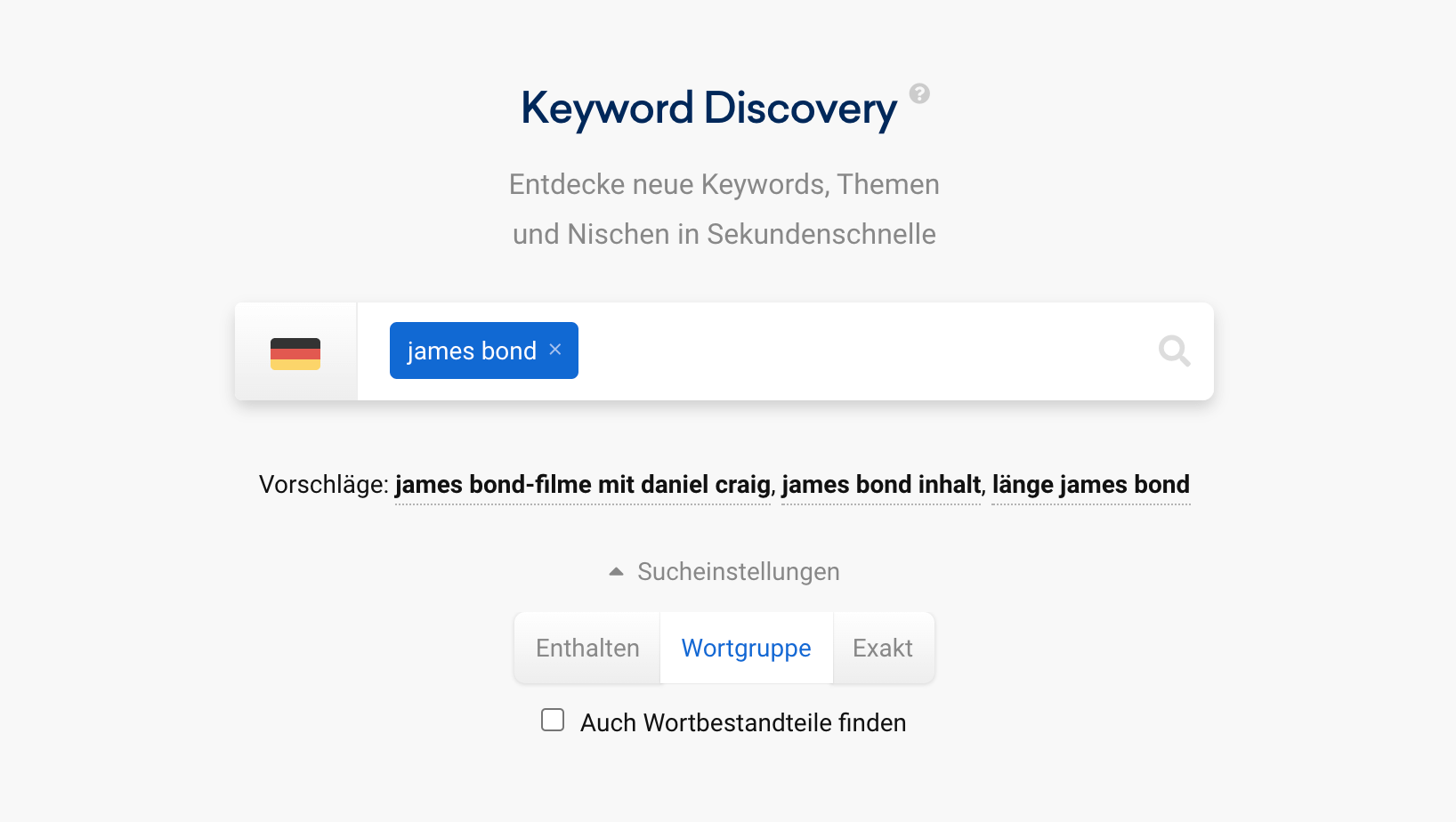 Die Keyword Discovery ist die Grundlage für den Zugriff auf das gesamte Keyword-Wissen und zu den Informationen in der Toolbox. Du gibst ein oder mehrere Keywords ein und wir erweitern diese Keywords mit ähnlichen Begriffen und sortieren die Ergebnisse so, dass sie leicht zu verstehen sind. Eine ausführliche Anleitung findest du in unserem Tutorial zum Keyword Discovery Tool.