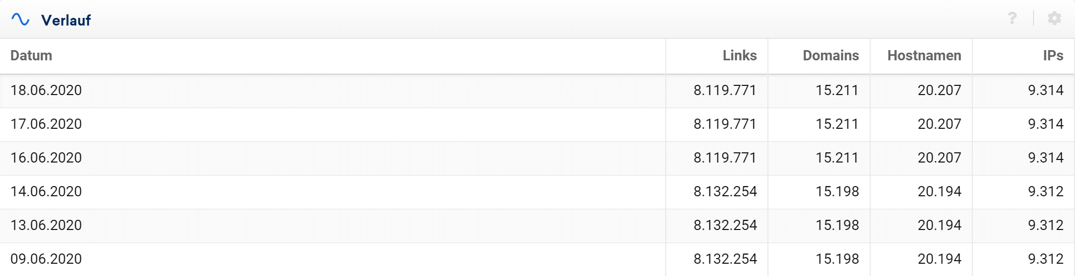 In der ersten Spalte siehst du das Datum, an dem die Domain gecrawlt wurde, und rechts die Anzahl der gefundenen Links, Domains, Hostnamen und IPs.