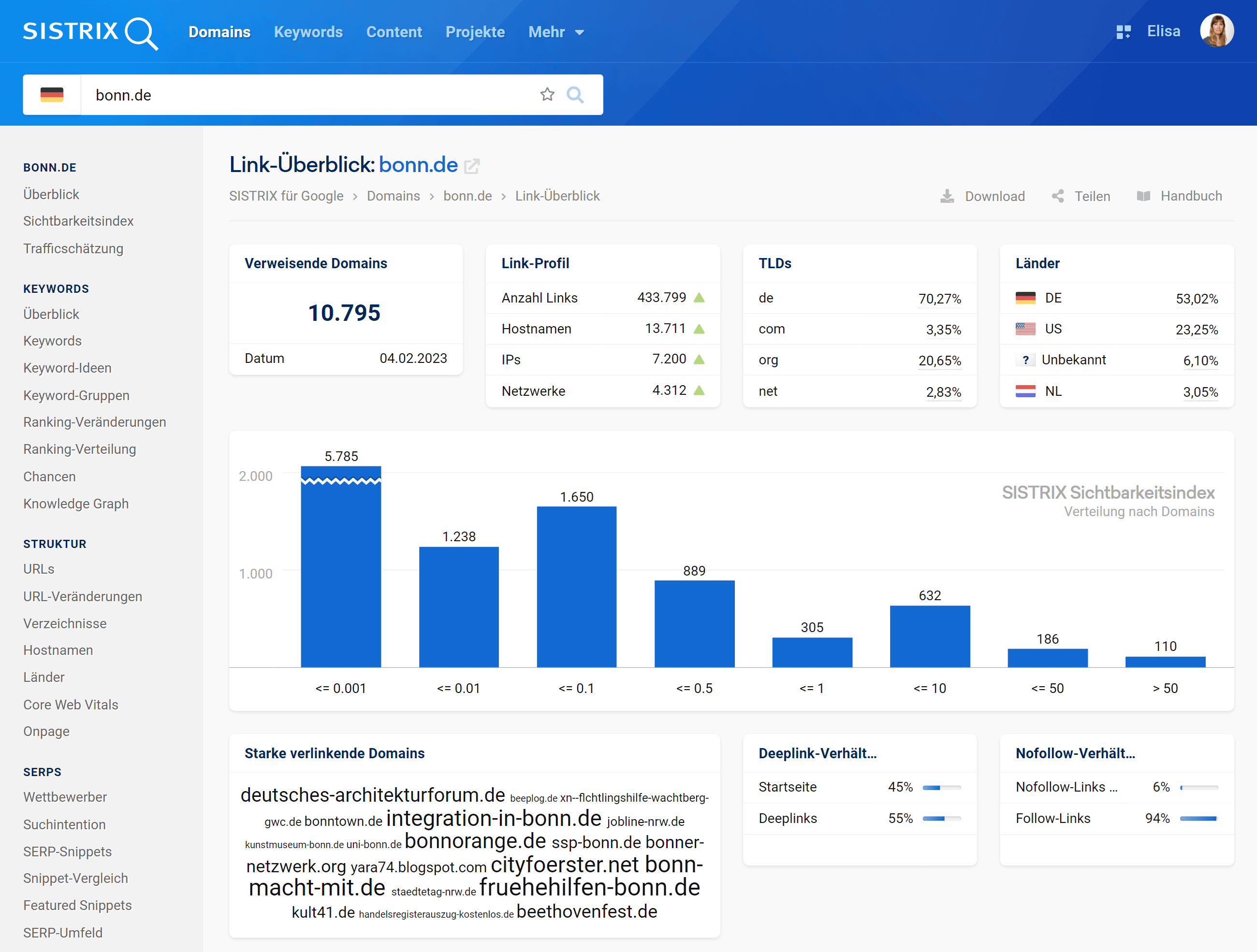 Dein Linkprofil zeigt Dir, wie viele Links von wievielen Hostnamen, Domains, Netzwerken und IP-Adressen stammen, gibt also Auskunft über die Link-Popularität Deiner Website. Der SISTRIX Crawler durchsucht zu diesem Zweck das Web und analysiert monatlich über 100 Milliarden Links.
