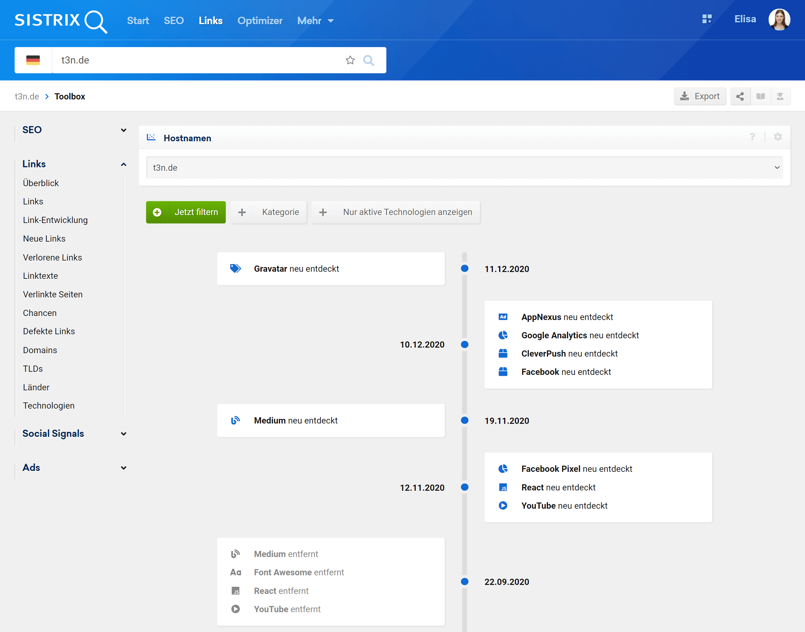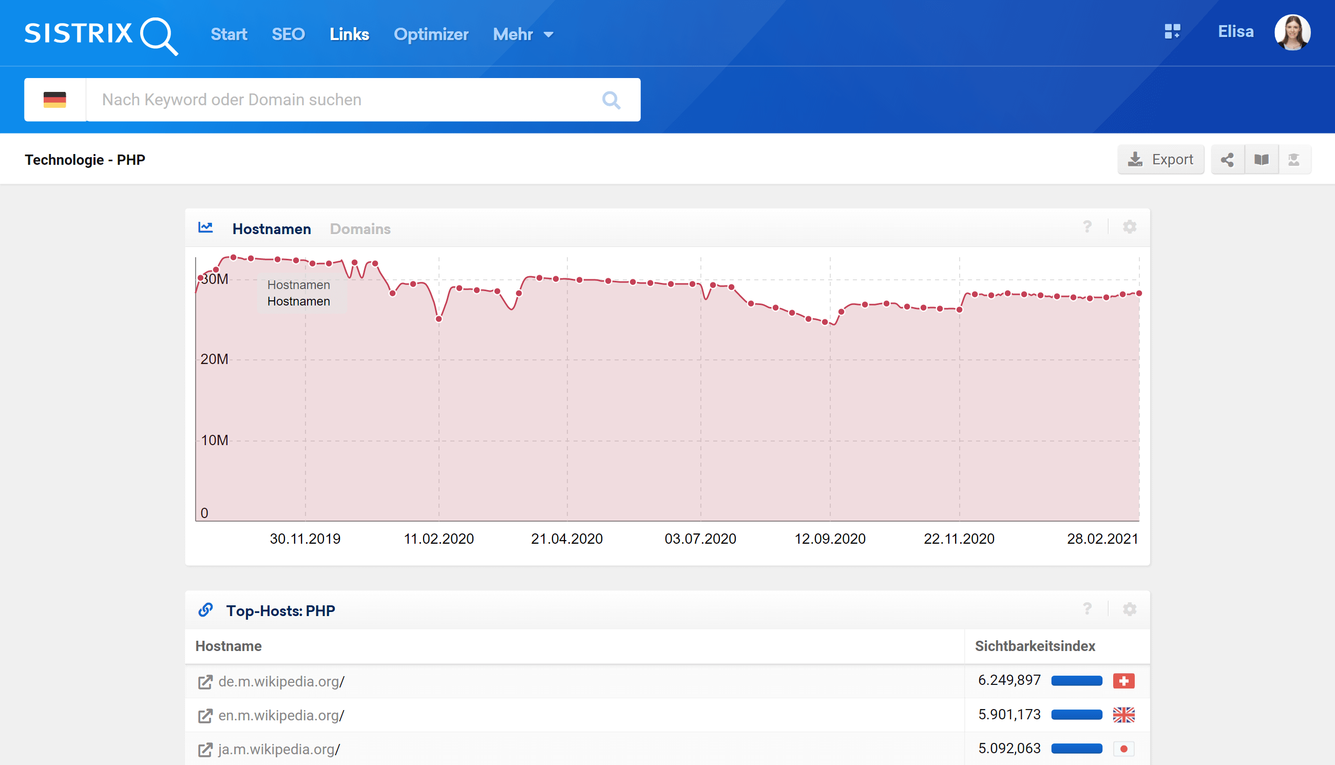 Die SISTRIX Toolbox kann dir dabei helfen, Technologien und Software, die auf Websites verwendet werden, zu identifizieren und zu vergleichen. Die Liste ist so sortiert, dass die sichtbarsten Hostnamen am Anfang der Liste stehen und du sie filtern und sortieren kannst.