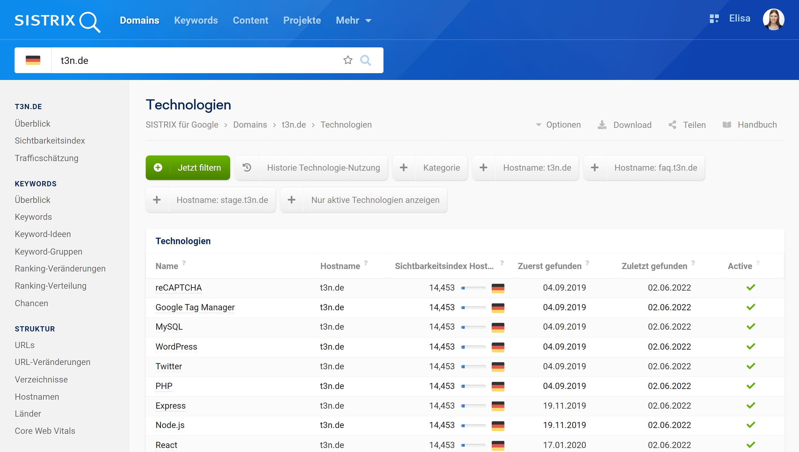 Klicken auf den grünen Button „Jetzt filtern“, um die Ergebnisse in der Tabelle zu filtern, oder auf die Quickfilter, um nur die Technologien eines bestimmten Hostnamens zu sehen.