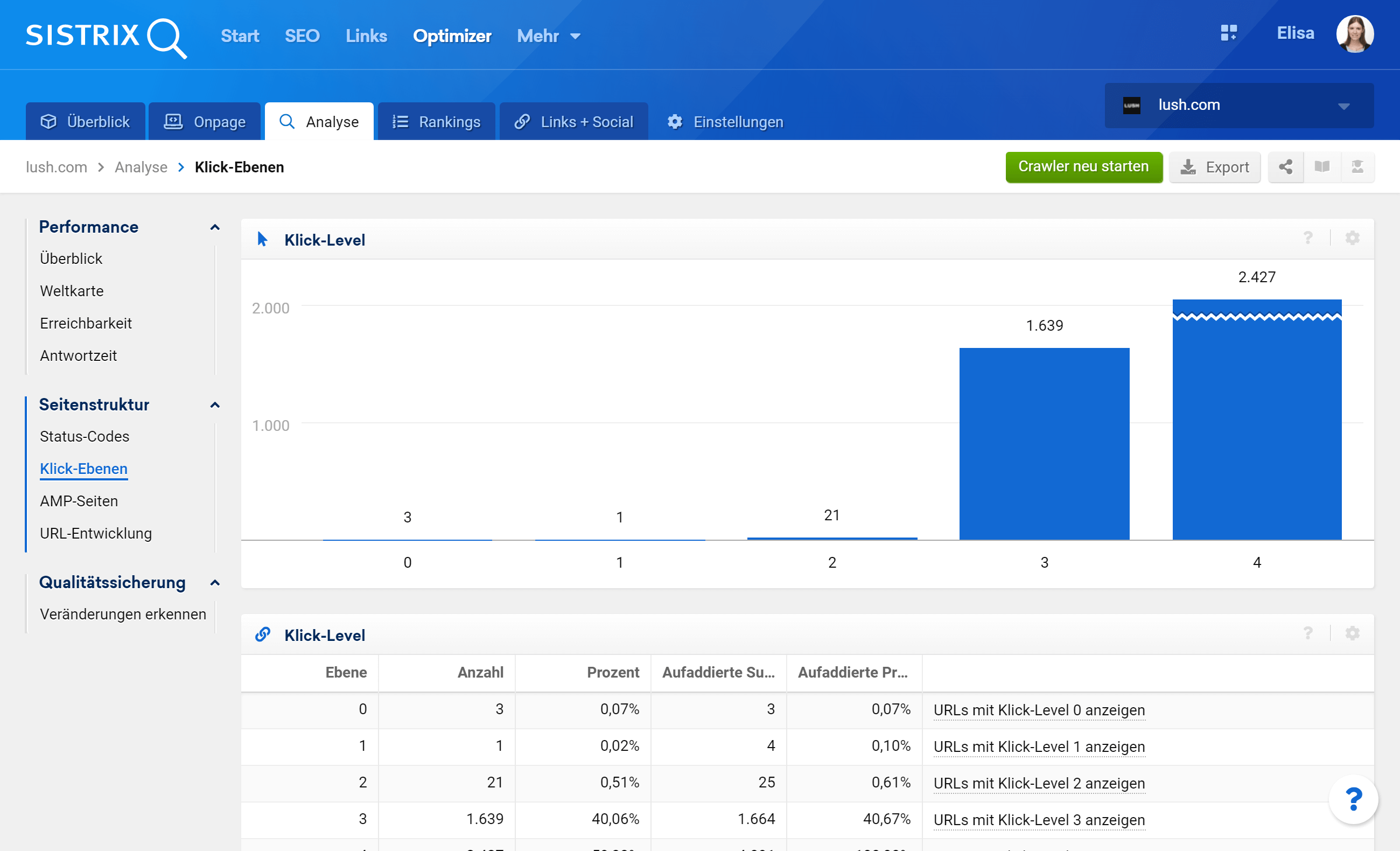 Mit ihnen kannst du schnell feststellen, wie groß bspw. der Anteil der Seiten ist, der drei Klicks von der Startseite entfernt ist – oder der Anteil der Seiten, der mindestens sechs Klicks von der Startseite ausgehend benötigt.