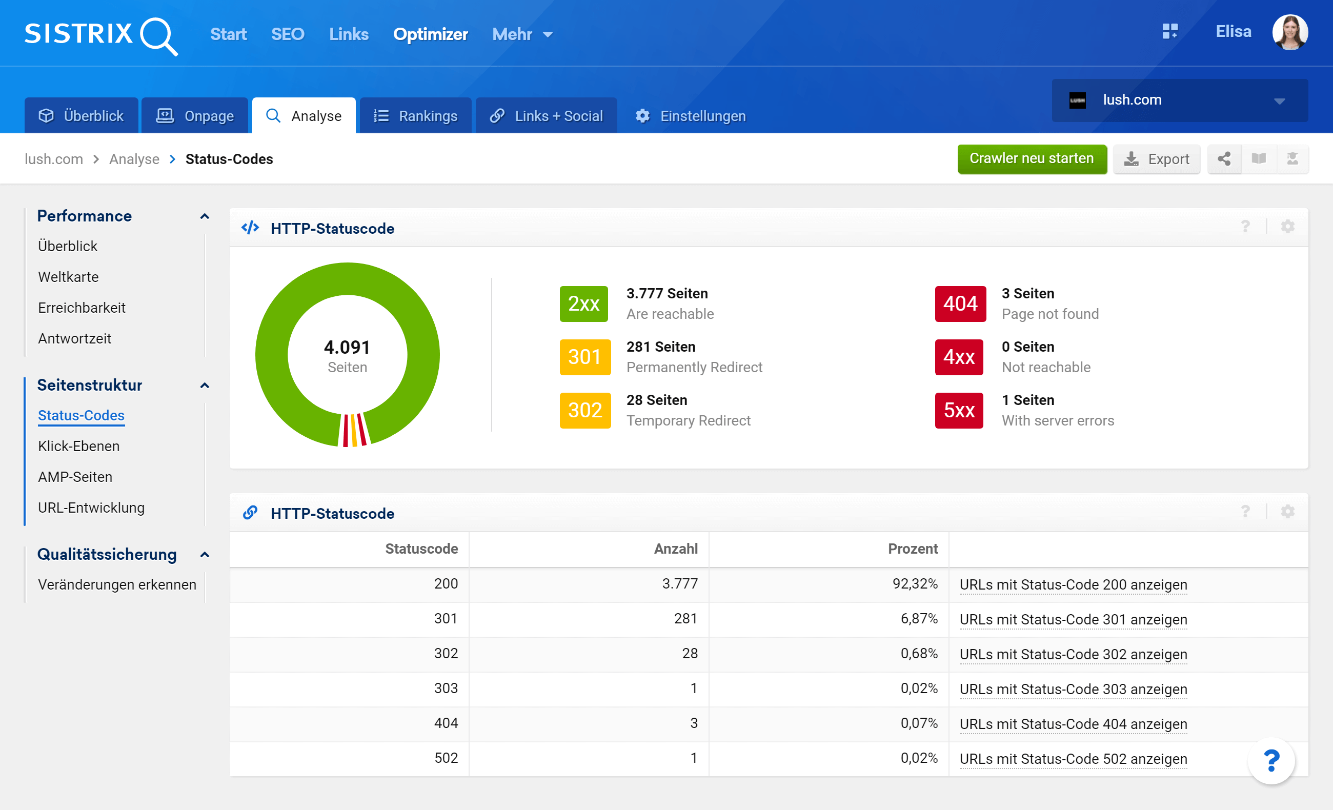 Wenn du auf „URLs mit Status-Code n anzeigen“ klickst, werden alle einzelnen URLs angezeigt, die die spezifischen Status-Codes generieren.