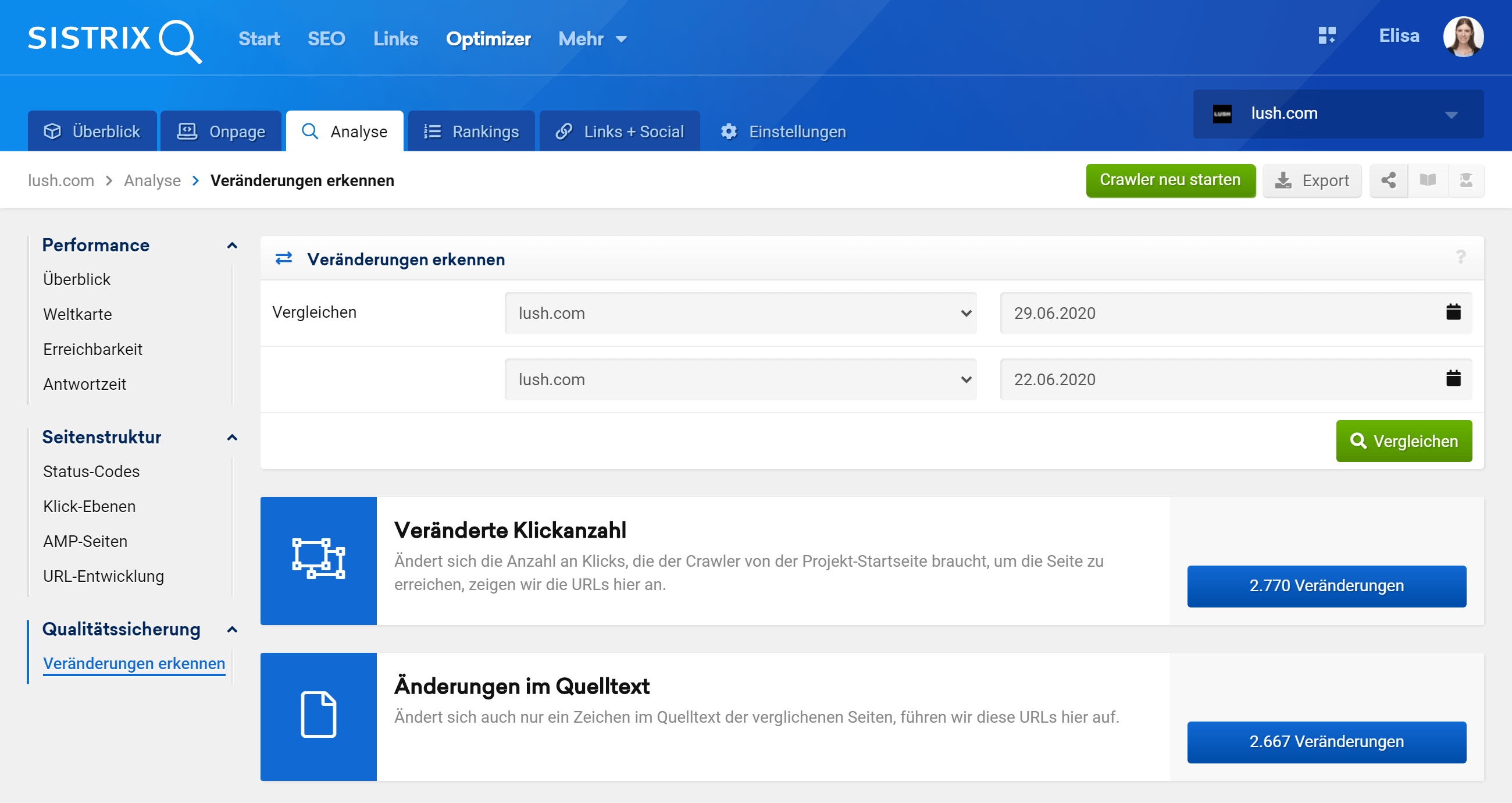 Diese Funktion ermöglicht es dir, zwei Crawls zu vergleichen, um Veränderungen zu sehen, die während dieses bestimmten Zeitraums an der Website vorgenommen wurden.