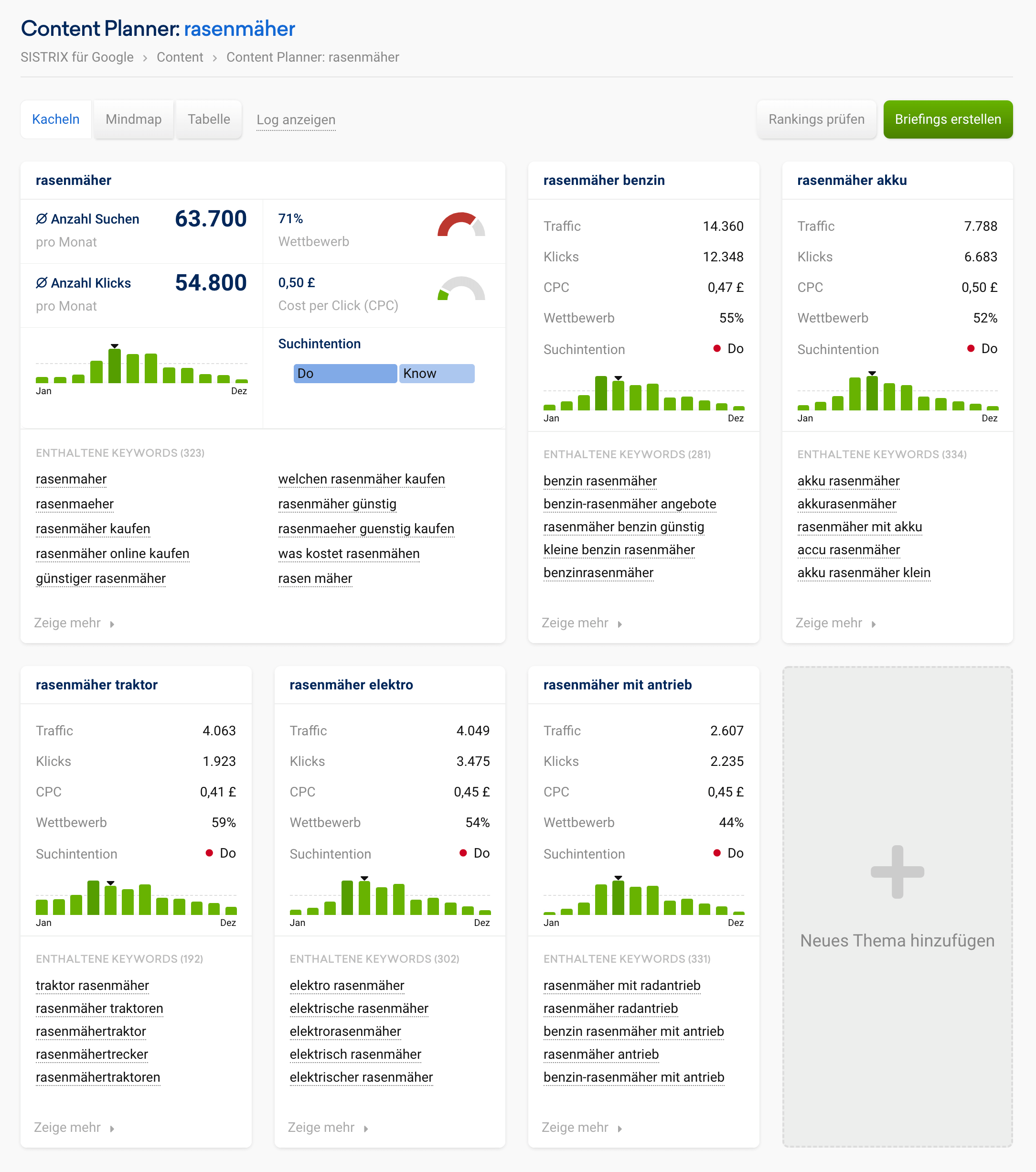 Die folgenden kleineren Kacheln zeigen Vorschläge für Cluster-Artikel an. Thematisch sind diese Keywords dem Hauptthema ähnlich, jedoch unterscheiden sie sich auch genug, um einen eigenen Artikel zu rechtfertigen.