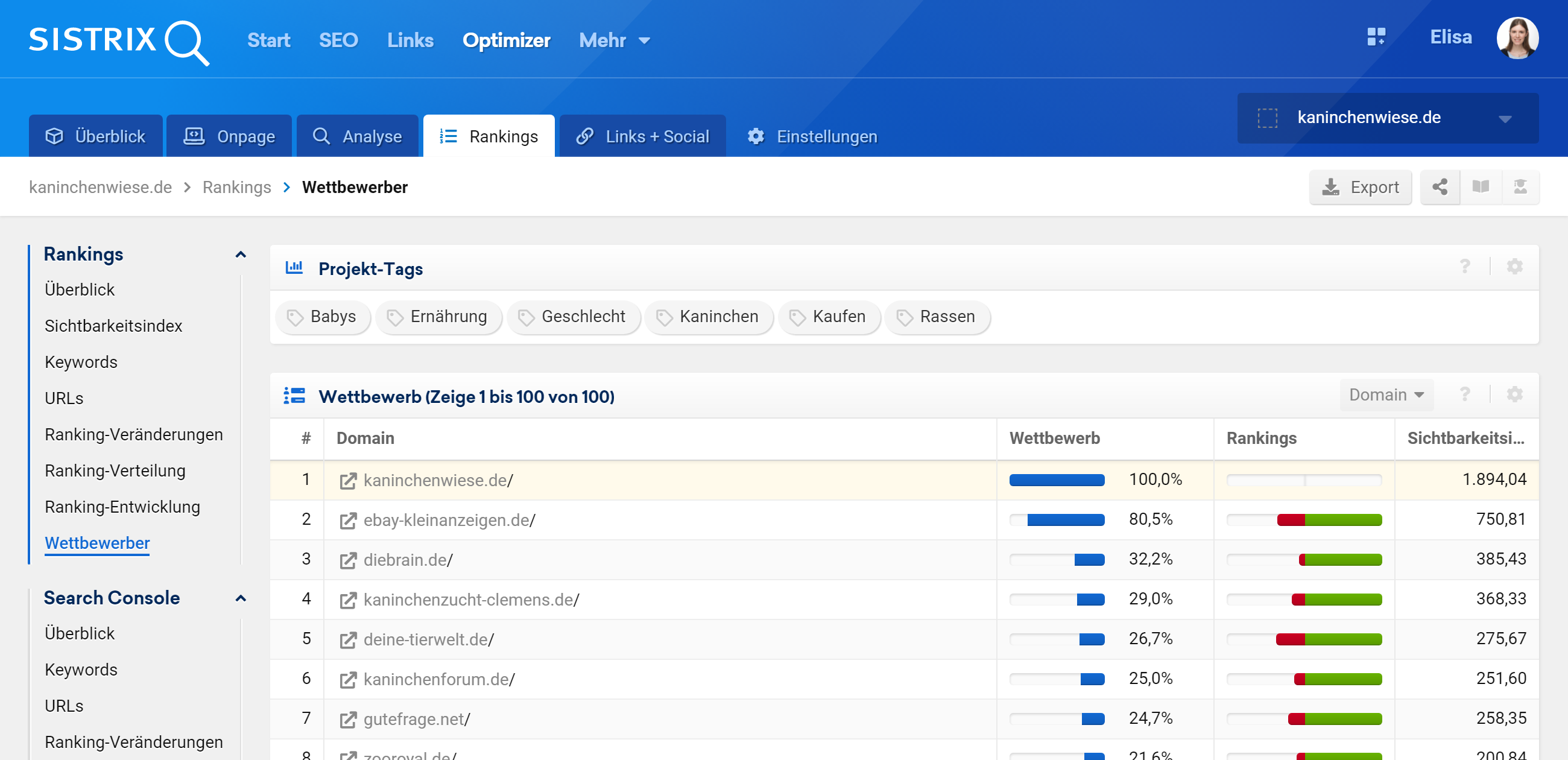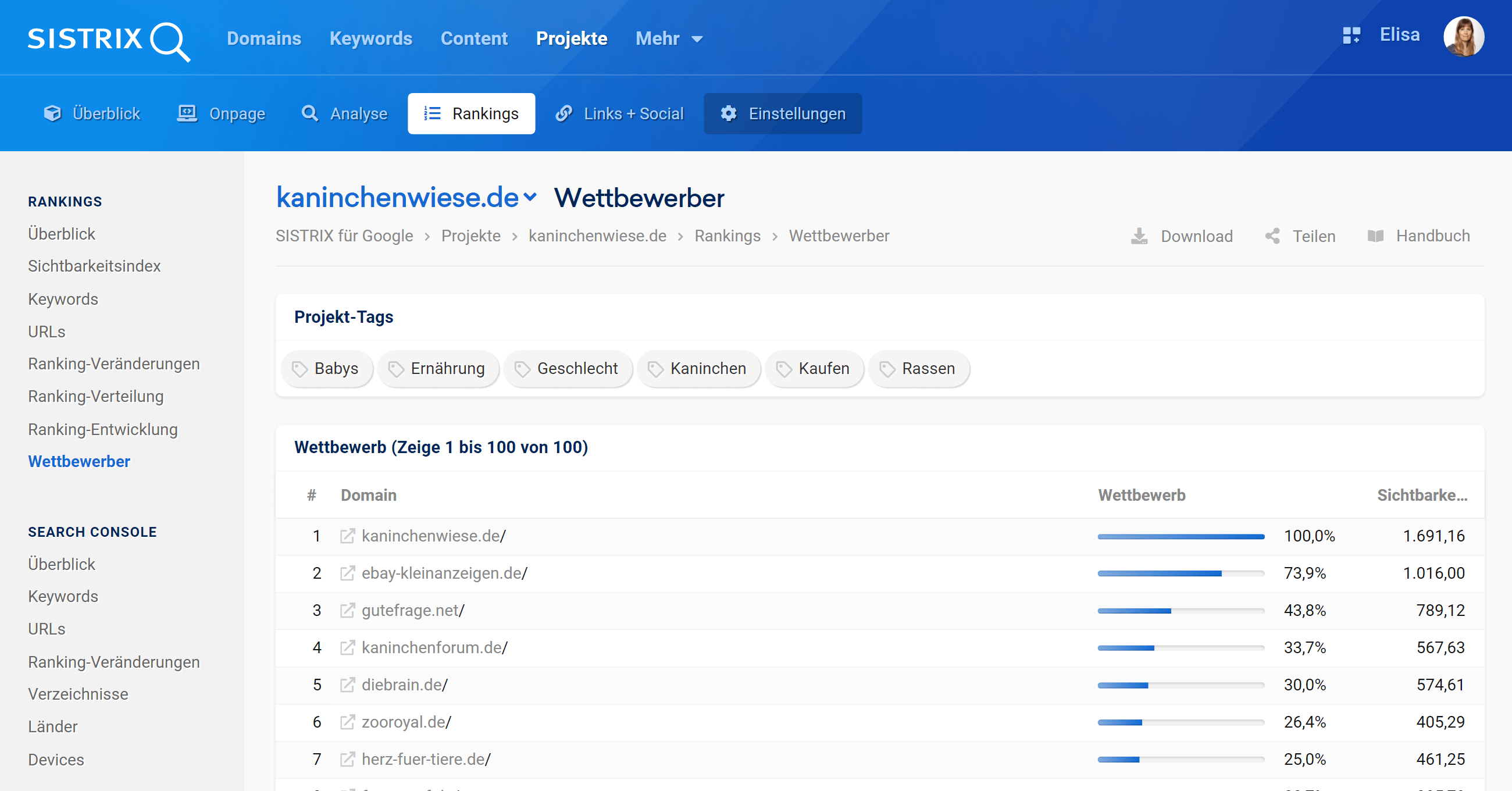 SISTRIX überwacht und archiviert dein Keyword-Set regelmäßig auf Basis der in deinem Onpage-Projekt festgelegten Crawling-Frequenz. Er erstellt auch eine Liste der direkten Wettbewerber, die für die Projektkeywords ranken. Die findest die Informationen in den Funktionen „Ranking-Entwicklung“ und „Wettbewerber“ in deinem Onpage-Projekt.