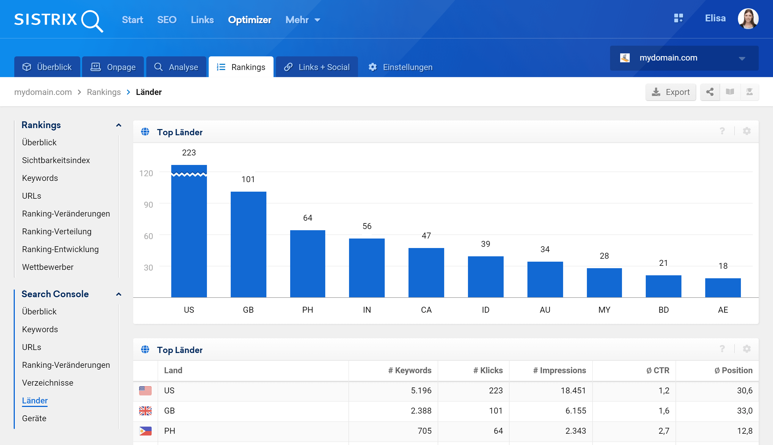 Wenn du die Daten deiner Google Search Console mit der SISTRIX Toolbox verknüpfst, erhältst du Einblicke in die Leistung deiner Domain, z.B. in das Gerät, das mehr Traffic erzeugt, sowie die Aufschlüsselung nach Ländern.
