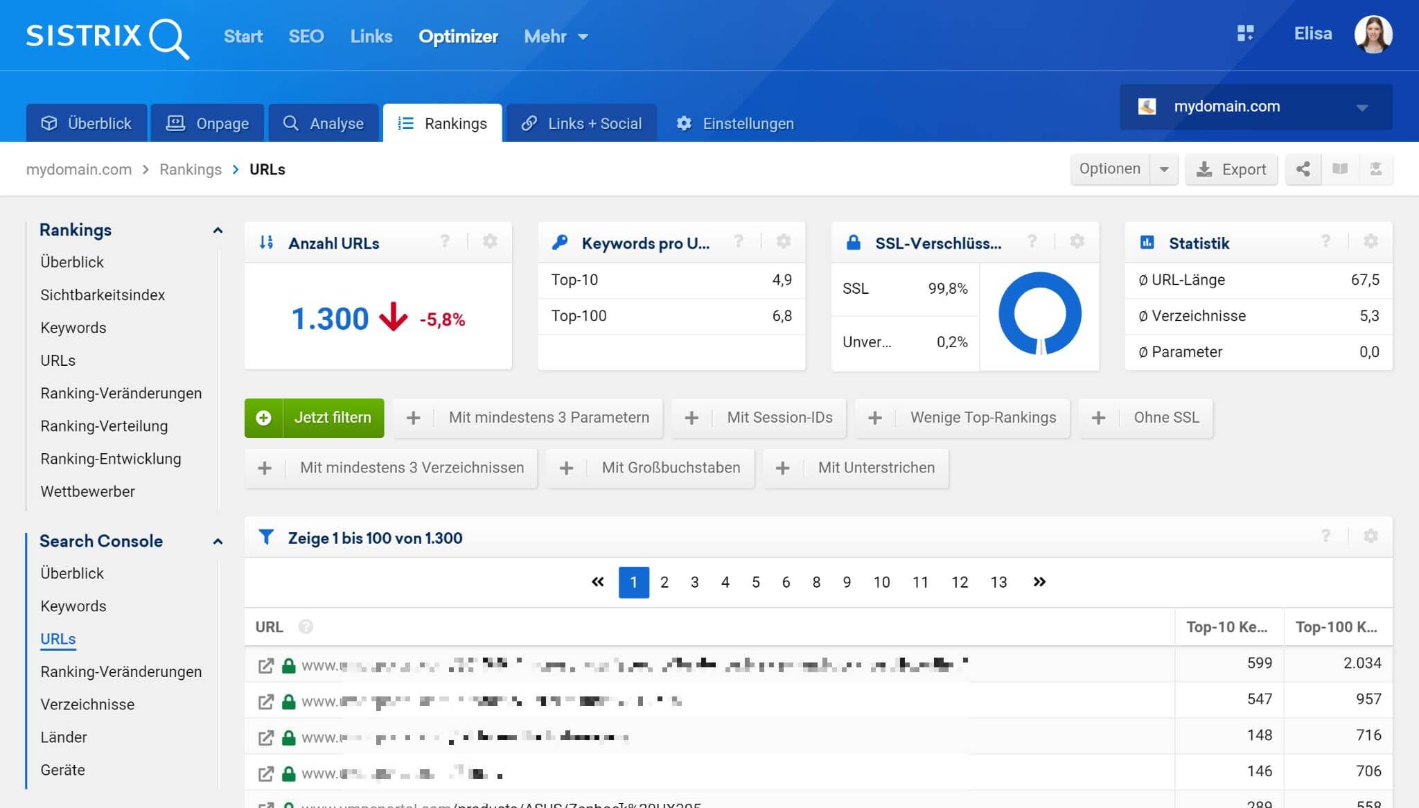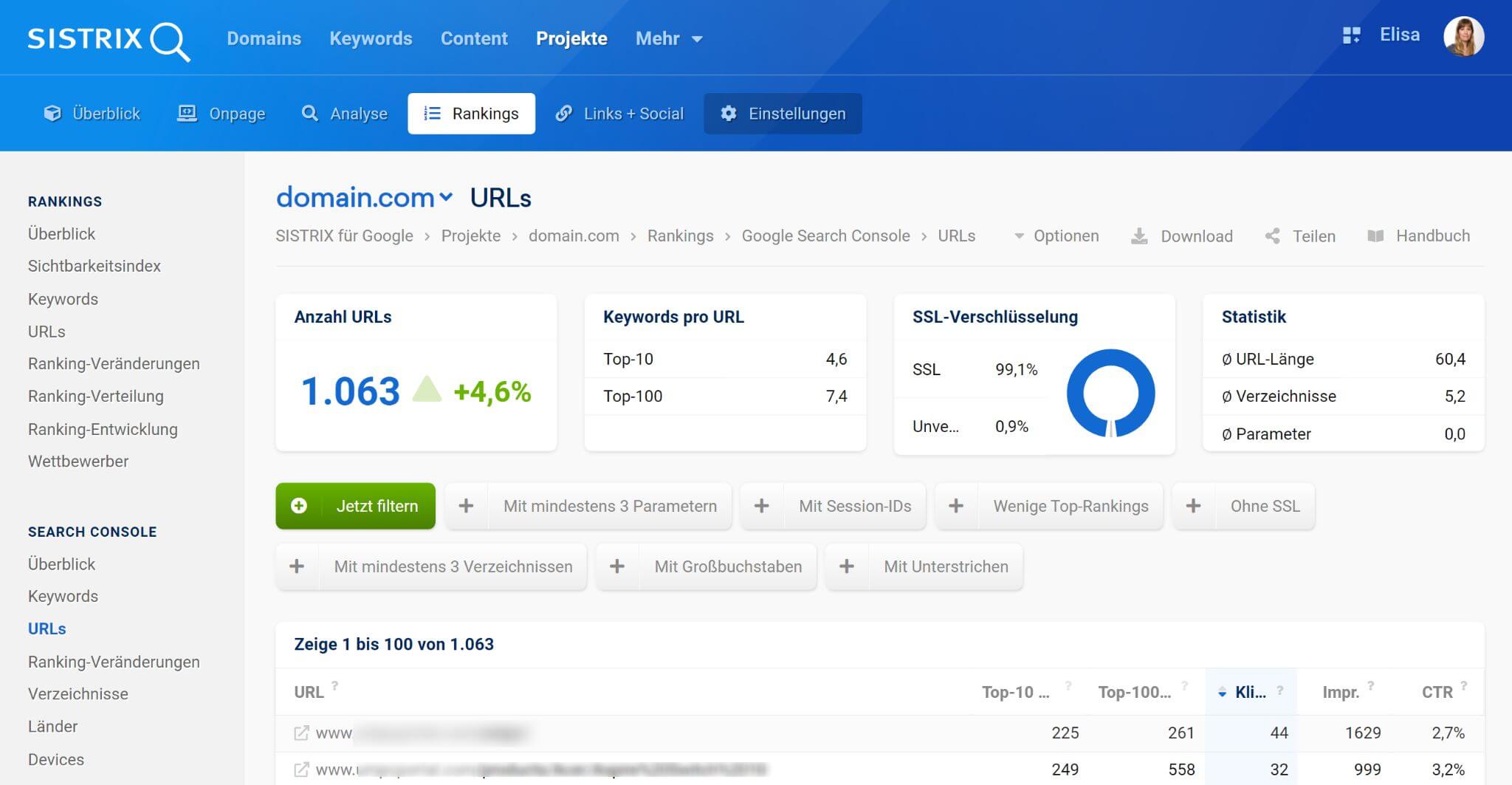 - SSL-Verschlüsselung: zeigt nur die URLs an die über das verschlüsselte Protokoll https laufen (SSL) oder über das unverschlüsselte Protokoll http ausgeliefert werden (Quickfilter: “Ohne SSL”).