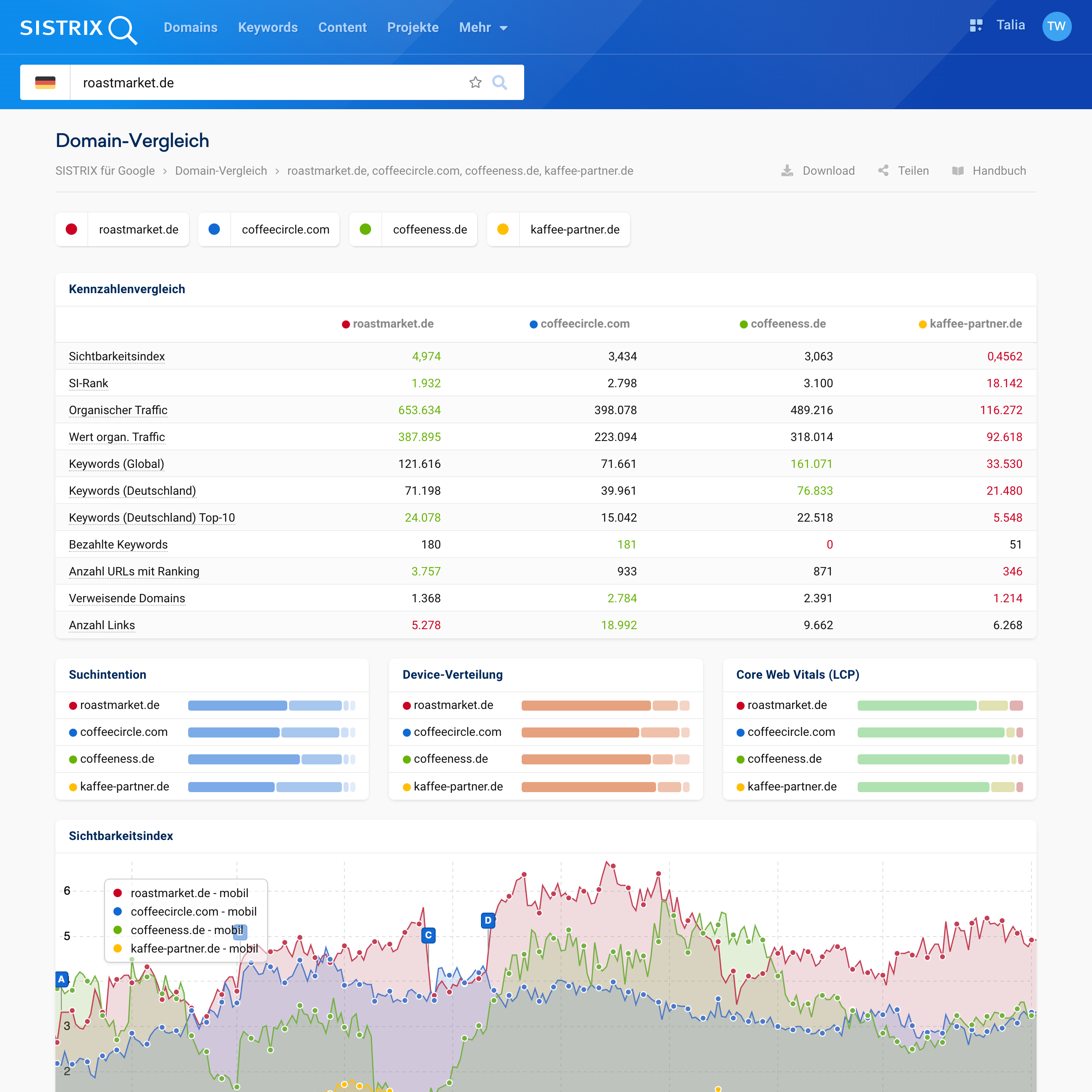 Die erste Tabelle zeigt dir die wichtigsten Kennzahlen der verglichenen Domains. Der leistungsfähigste Wert ist grün markiert, der schlechteste rot. So findest du leicht die Stärken und Schwächen deiner Wettbewerber und die deiner eigenen Domain.