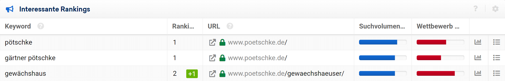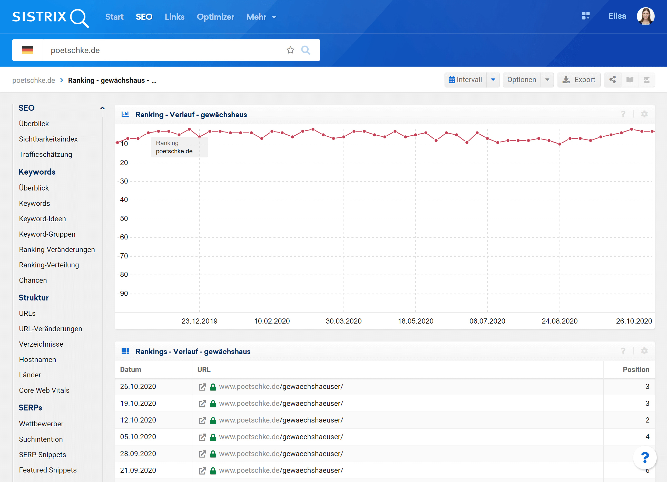 Diese Tabelle zeigt dir die Position und die Ranking-URL für die untersuchte Domain, sowie alle Datenpunkte der letzten 12 Monate.