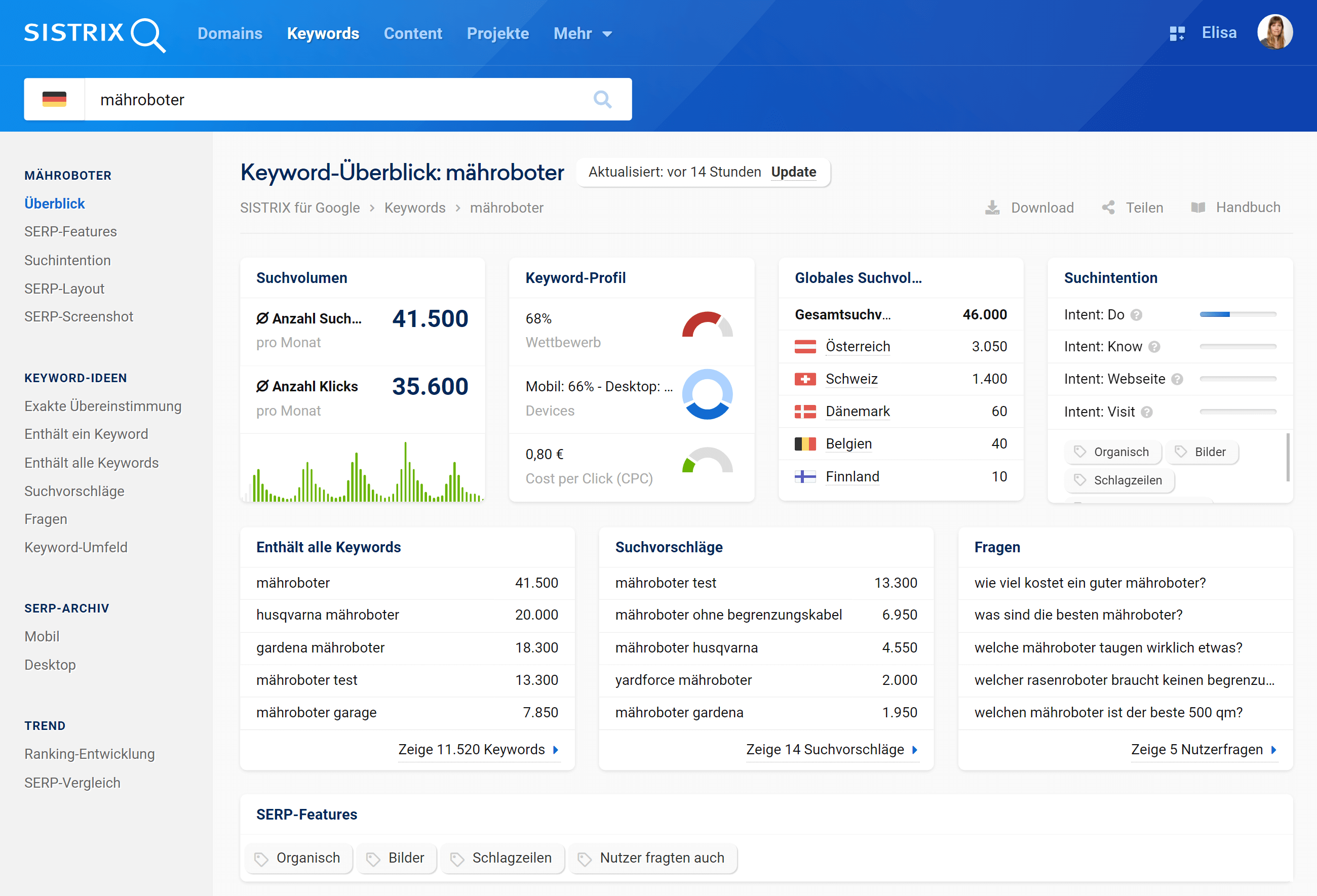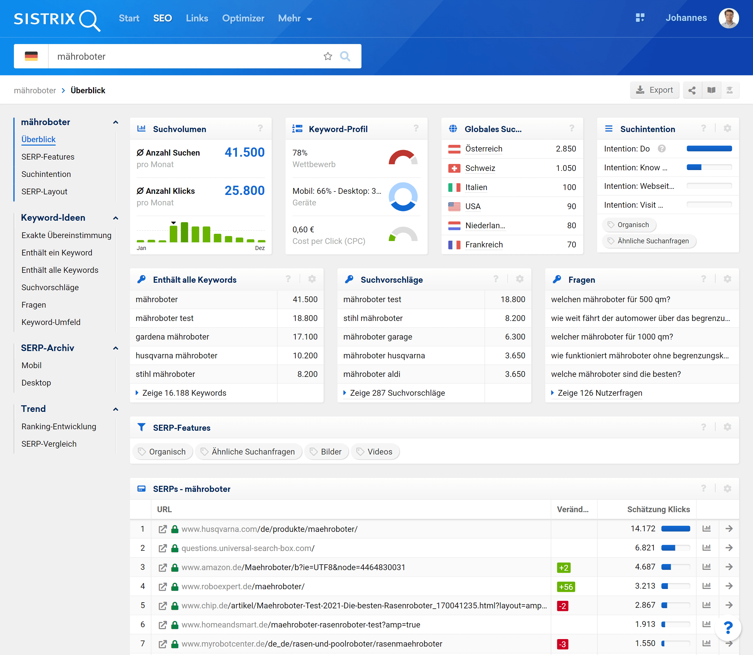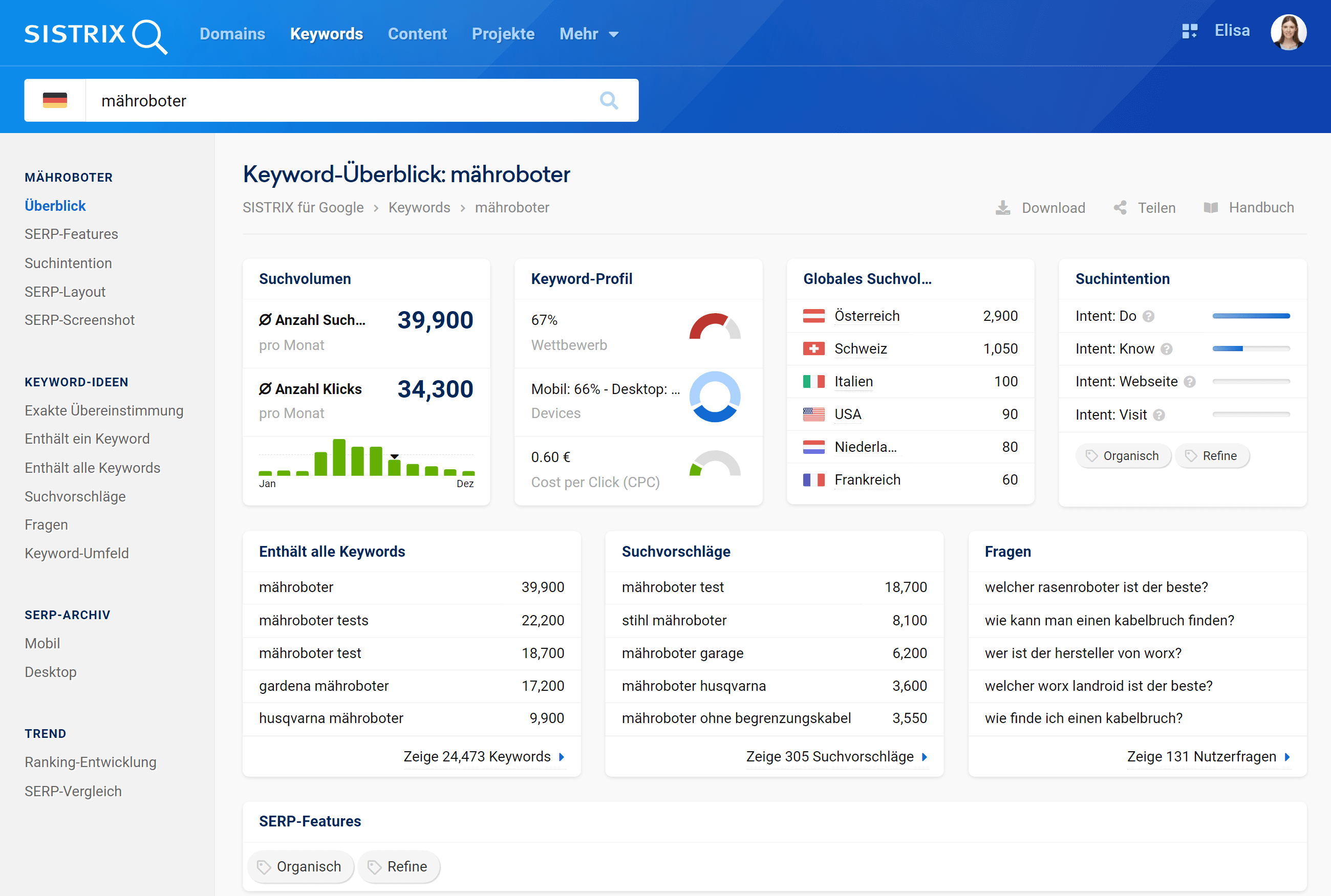 Um tiefer in die Analyse dieses Keywords einzusteigen, nutze die Navigation an der Seite und wähle den gewünschten Bereich aus. Die erste Zeile des Überblicks zeigt dir in vier Boxen Informationen zu diesen Bereichen an: