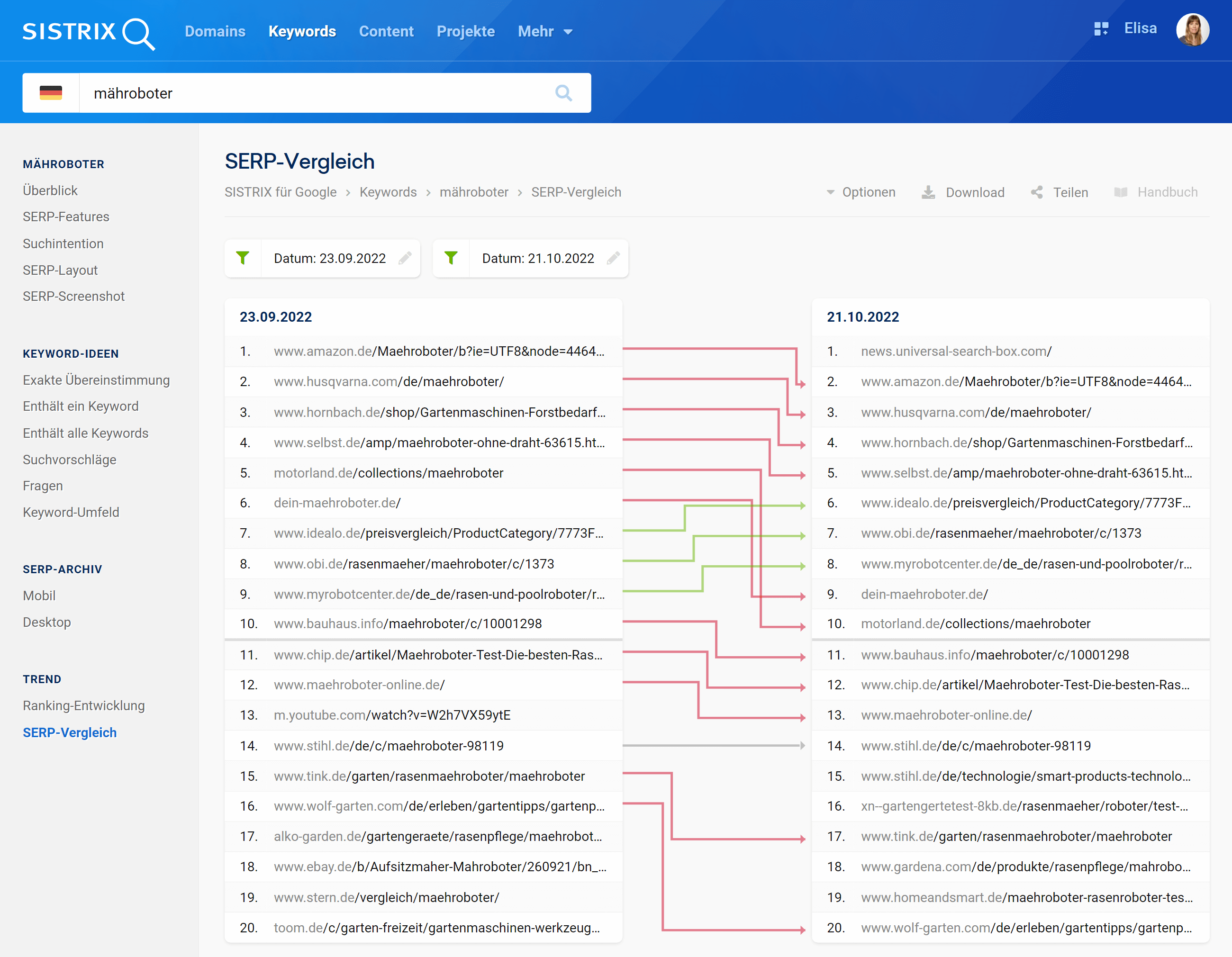 In der Analyse zeigt dir die Toolbox durch Pfeile, wie sich die Rankings in diesem Zeitraum verändert haben. Rankt die Domain nun besser als vorher, ist der Pfeil grün. Rankt sie schlechter als zuvor, ist der Pfeil rot. Keine Veränderung des Rankings wird durch einen grauen Pfeil dargestellt.