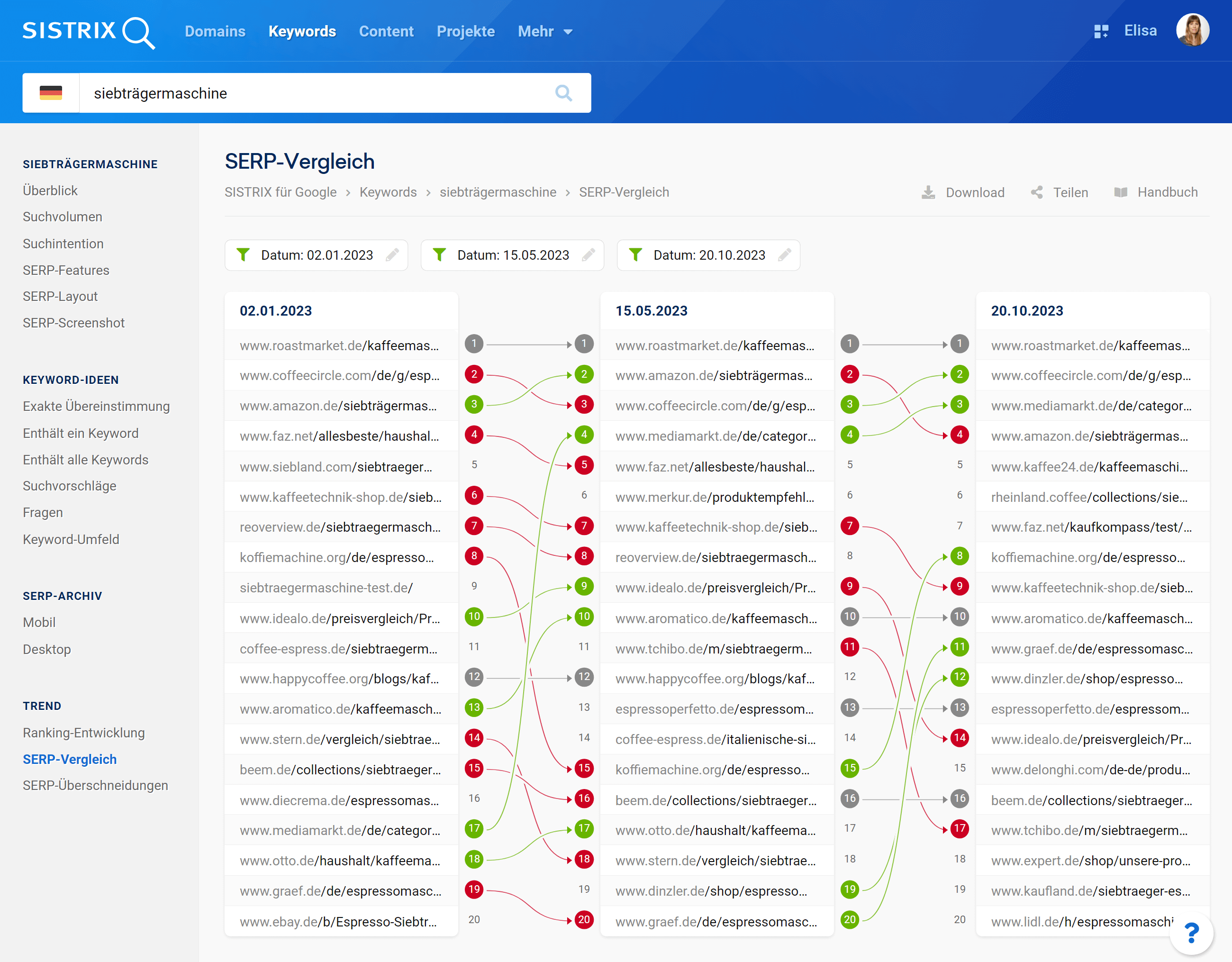 Das SERP-Archiv ist eine Zeitmaschine für vergangene Suchergebnisse. Seit 2008 speichert die Toolbox die jeweiligen SERPs für alle relevanten Suchbegriffe. Mit dem SERP-Archiv kannst du also einfach in der Zeit zurück reisen und Entwicklungen nachvollziehen.