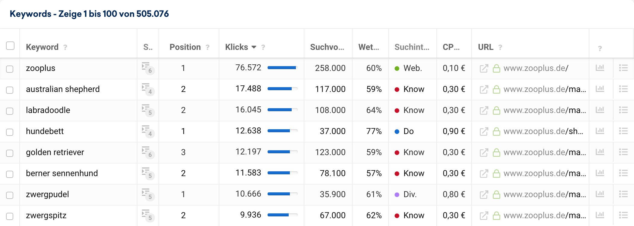 - Klicks: Geschätzte Anzahl der organischen Klicks auf dieser Seite. Der Balken zeigt an, wie hoch der Klickwert des entsprechenden Eintrags im Vergleich zum höchsten Wert in der Tabelle ist (mehr).