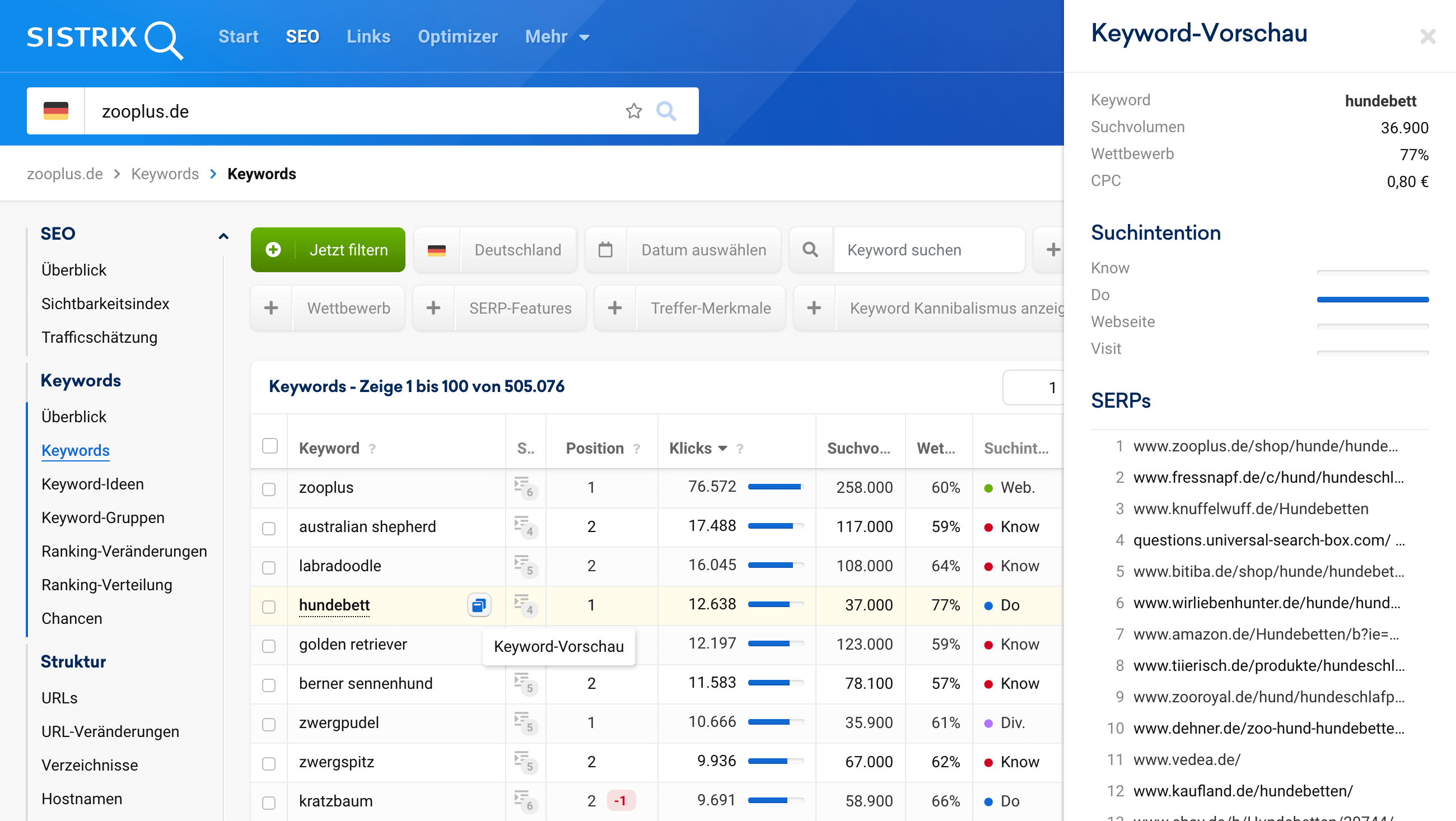 Die Keyword-Tabelle ist eines der zentralen Analysewerkzeuge in der Toolbox: hier siehst du alle von uns gefundenen Rankings der untersuchten Domain, kannst sie sortieren, filtern, analysieren und exportieren.