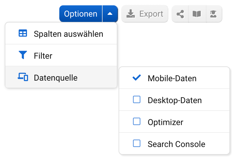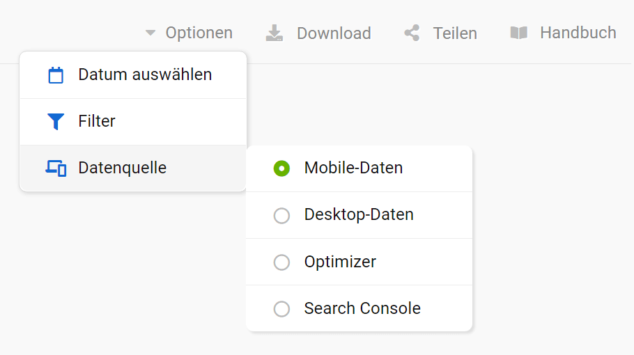- Datenquelle: die umfassendsten Daten liefert die Toolbox in der erweiterten Datenbasis für Mobile-SERPs. Hier kannst du auf andere Datenquellen umschalten: Desktop-Treffer, deine eigenen Projekt-Keywords oder die Google Search Console.