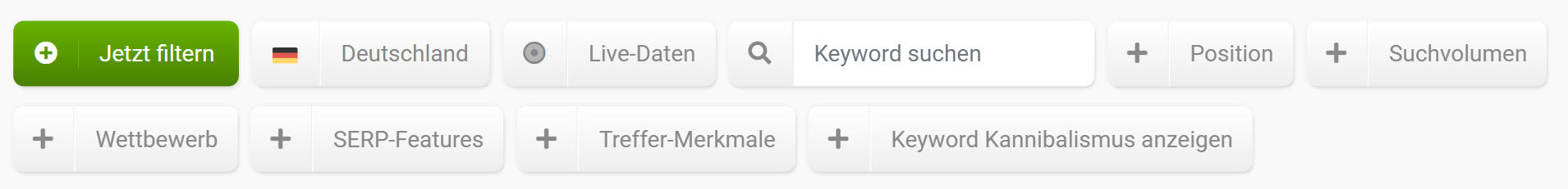 Mit den Tabellen-Filtern kannst du die angezeigten Ergebnisse einfach und schnell filtern: wähle einen der bereits vorgeschlagenen Quickfilter aus oder klicke auf den grünen Button “Jetzt filtern” um selber aus den mehr als 30 Filter-Optionen auszuwählen. Sehr komplexe Filter kannst du mit dem Experten-Filter erstellen.