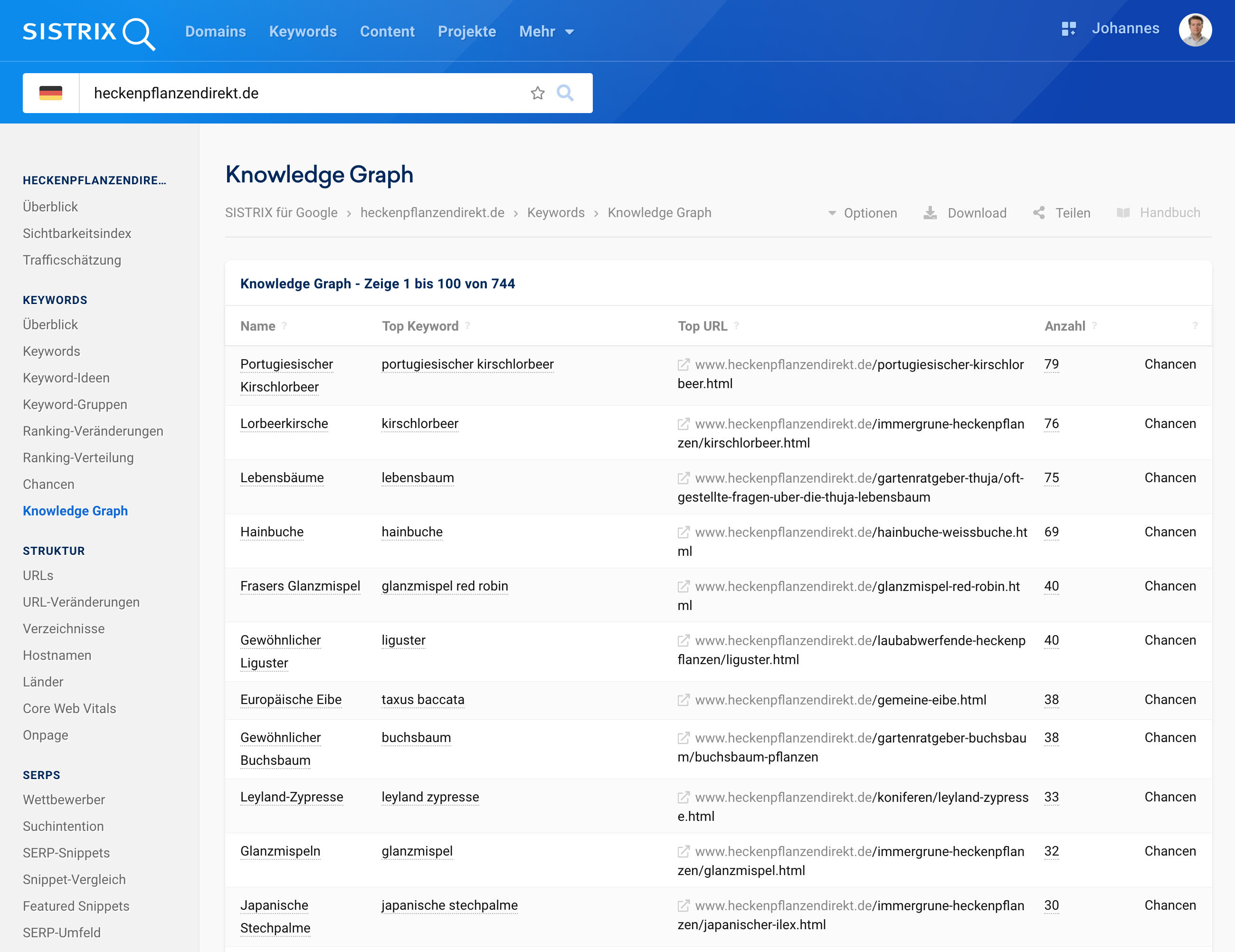 - Anzahl: Hier siehst du, für wie viele Keywords, bei denen die entsprechende Knowledge Graph-Box angezeigt wird, die Domain insgesamt rankt. Mit einem Klick auf die Zahl kommst du direkt zur vorgefilterten Keyword-Tabelle.
