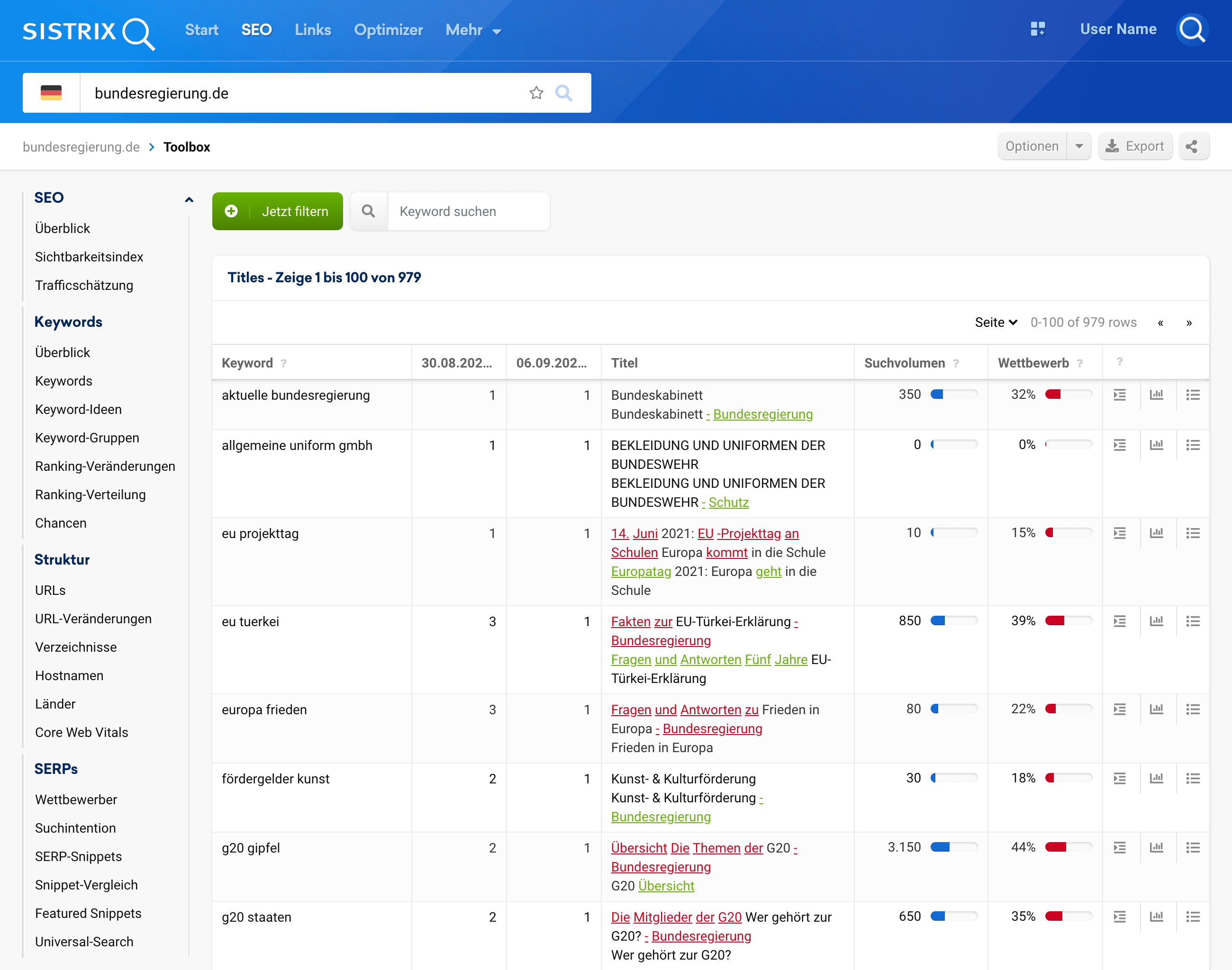 • SERPs: Link zur SERP-Tabelle innerhalb der Toolbox.