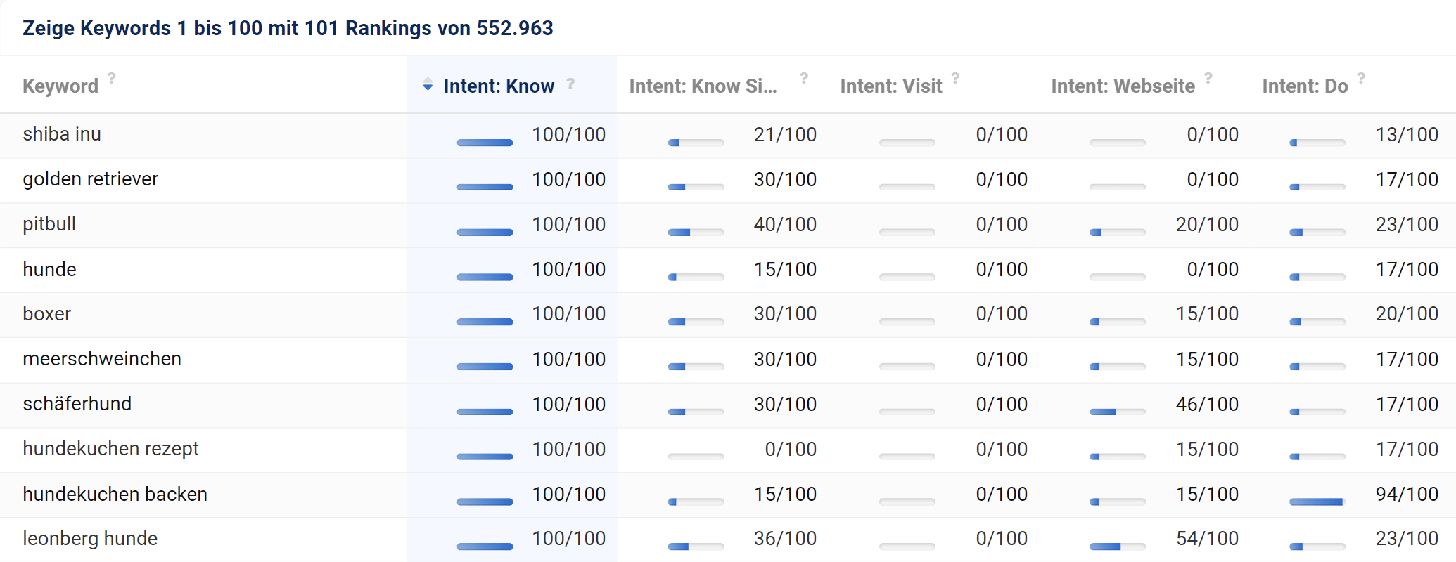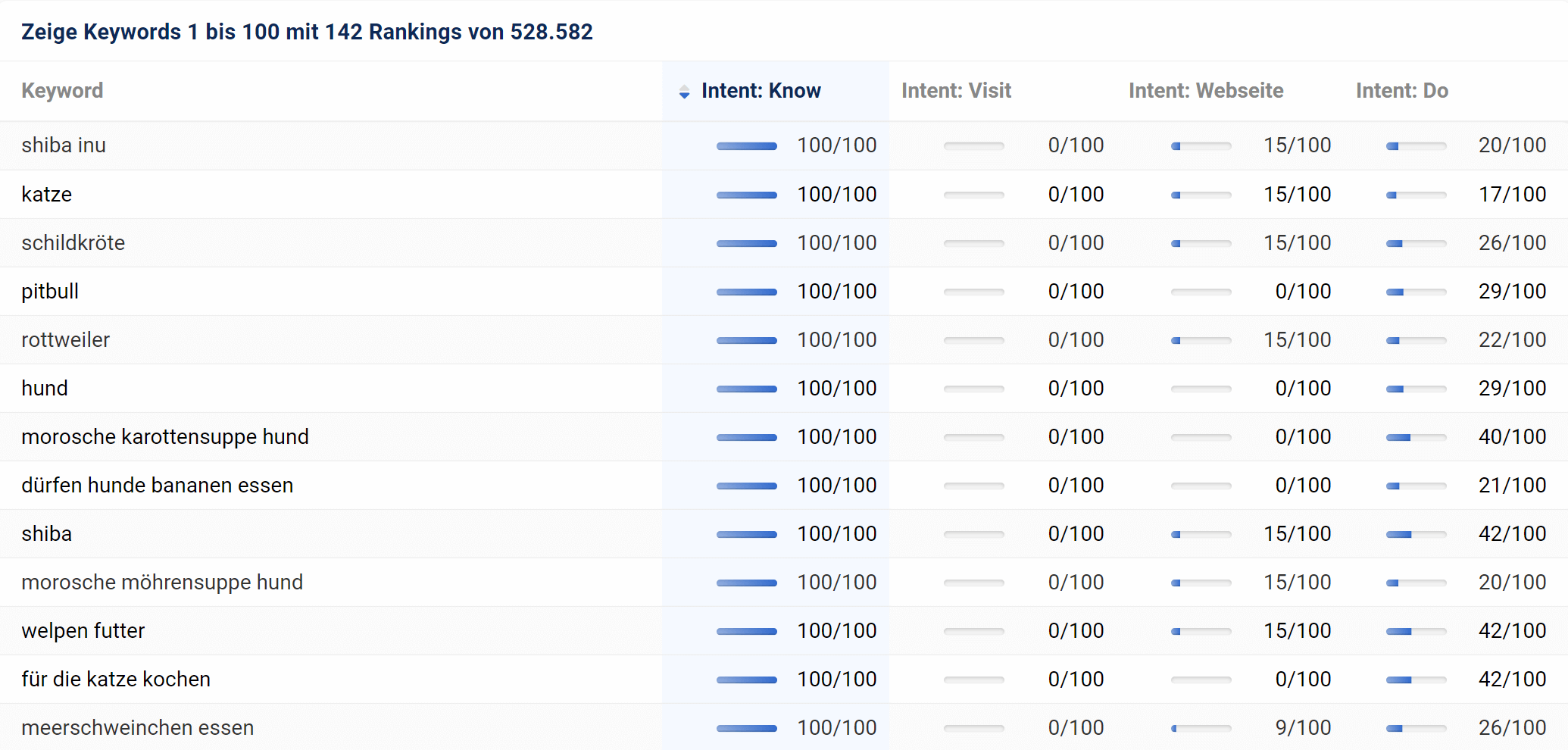 Da manche Keywords auch mehr als eine Suchintention abdecken, gibt es keine Abhängigkeit untereinander – ein Keyword kann also sowohl für Do als auch für Know hohe Werte erhalten.